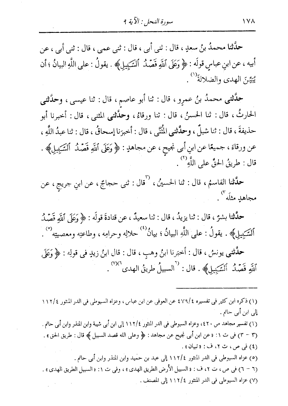حَدَّثَنِي مُحَمَّدُ بْنُ عَمْرٍو، قَالَ: ثنا أَبُو عَاصِمٍ، قَالَ: ثنا عِيسَى، وَحَدَّثَنِي الْحَرْثُ، قَالَ: ثنا الْحَسَنُ، قَالَ: ثنا وَرْقَاءُ، وَحَدَّثَنِي الْمُثَنَّى، قَالَ: أَخْبَرَنَا أَبُو حُذَيْفَةَ، قَالَ: ثنا شِبْلٌ، وَحَدَّثَنِي الْمُثَنَّى، قَالَ: أَخْبَرَنَا إِسْحَاقُ، قَالَ: ثنا عَبْدُ اللَّهِ، عَنْ وَرْقَاءَ، جَمِيعًا عَنِ ابْنِ أَبِي نَجِيحٍ، عَنْ مُجَاهِدٍ: {§وَعَلَى اللَّهِ قَصْدُ السَّبِيلِ} [النحل: 9] قَالَ: «طَرِيقُ الْحَقِّ عَلَى اللَّهِ» . حَدَّثَنَا الْقَاسِمُ قَالَ: ثنا الْحُسَيْنُ قَالَ: ثني حَجَّاجٌ، عَنِ ابْنِ جُرَيْجٍ، عَنْ مُجَاهِدٍ، مِثْلَهُ