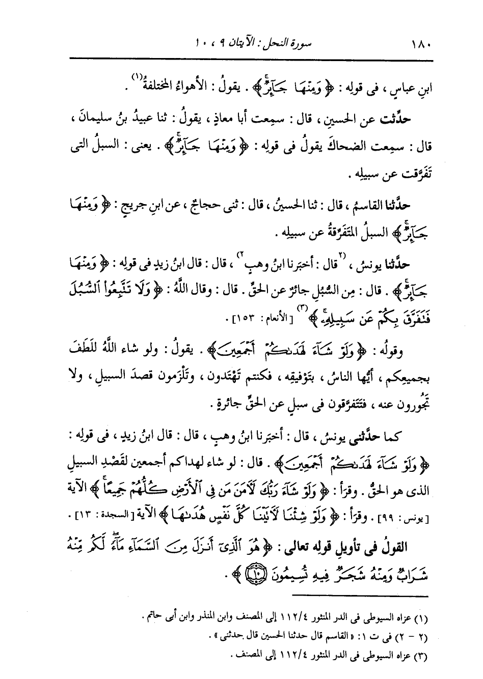 حَدَّثَنَا الْقَاسِمُ، قَالَ: ثنا الْحُسَيْنُ، قَالَ: ثني حَجَّاجٌ، عَنِ ابْنِ جُرَيْجٍ: " {§وَمِنْهَا جَائِرٌ} [النحل: 9] السُّبُلُ الْمُتَفَرِّقَةُ عَنْ سَبِيلِهِ "