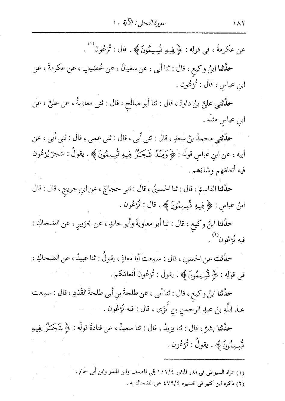 حَدَّثَنَا ابْنُ وَكِيعٍ، قَالَ: ثنا أَبِي، عَنْ سُفْيَانَ، عَنْ خُصَيْفٍ، عَنْ عِكْرِمَةَ، عَنِ ابْنِ عَبَّاسٍ، قَالَ: «§تَرْعَوْنَ» . حَدَّثَنِي عَلِيُّ بْنُ دَاوُدَ، قَالَ: ثنا أَبُو صَالِحٍ، قَالَ: ثني مُعَاوِيَةُ، عَنْ عَلِيٍّ، عَنِ ابْنِ عَبَّاسٍ، مِثْلَهُ