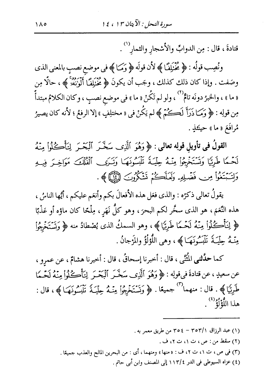 حَدَّثَنِي الْمُثَنَّى، قَالَ: أَخْبَرَنَا إِسْحَاقُ، قَالَ: أَخْبَرَنَا هِشَامٌ، عَنْ عَمْرٍو، عَنْ سَعِيدٍ، عَنْ قَتَادَةَ، فِي قَوْلِهِ: {§وَهُوَ الَّذِي سَخَّرَ الْبَحْرَ لِتَأْكُلُوا مِنْهُ لَحْمًا طَرِيًّا} [النحل: 14] قَالَ: " مِنْهُمَا جَمِيعًا {وَتَسْتَخْرِجُوا مِنْهُ حِلْيَةً تَلْبَسُونَهَا} [النحل: 14] قَالَ: «هَذَا اللُّؤْلُؤُ»