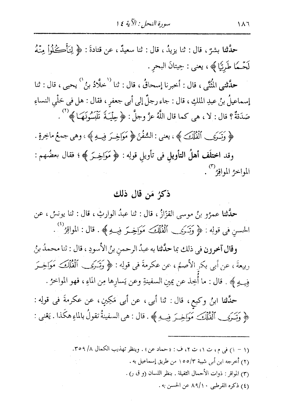 حَدَّثَنِي الْمُثَنَّى، قَالَ: أَخْبَرَنَا إِسْحَاقُ، قَالَ: ثنا حَمَّادٌ، عَنْ يَحْيَى، قَالَ: ثنا إِسْمَاعِيلُ بْنُ عَبْدِ الْمَلِكِ، قَالَ: جَاءَ رَجُلٌ إِلَى أَبِي جَعْفَرٍ، فَقَالَ: «§هَلْ فِي حُلِيِّ النِّسَاءِ صَدَقَةٌ؟» قَالَ: " لَا، هِيَ كَمَا قَالَ اللَّهُ تَعَالَى: {حِلْيَةً تَلْبَسُونَهَا وَتَرَى الْفُلْكَ} [النحل: 14] يَعْنِي السُّفُنَ، {مَوَاخِرَ فِيهِ} [النحل: 14] وَهِيَ جَمْعُ مَاخِرَةٍ ". وَقَدِ اخْتَلَفَ أَهْلُ التَّأْوِيلِ فِي تَأْوِيلِ قَوْلِهِ: {مَوَاخِرَ} [النحل: 14] ، فَقَالَ بَعْضُهُمْ: الْمَوَاخِرَ: الْمَوَاقِرَ