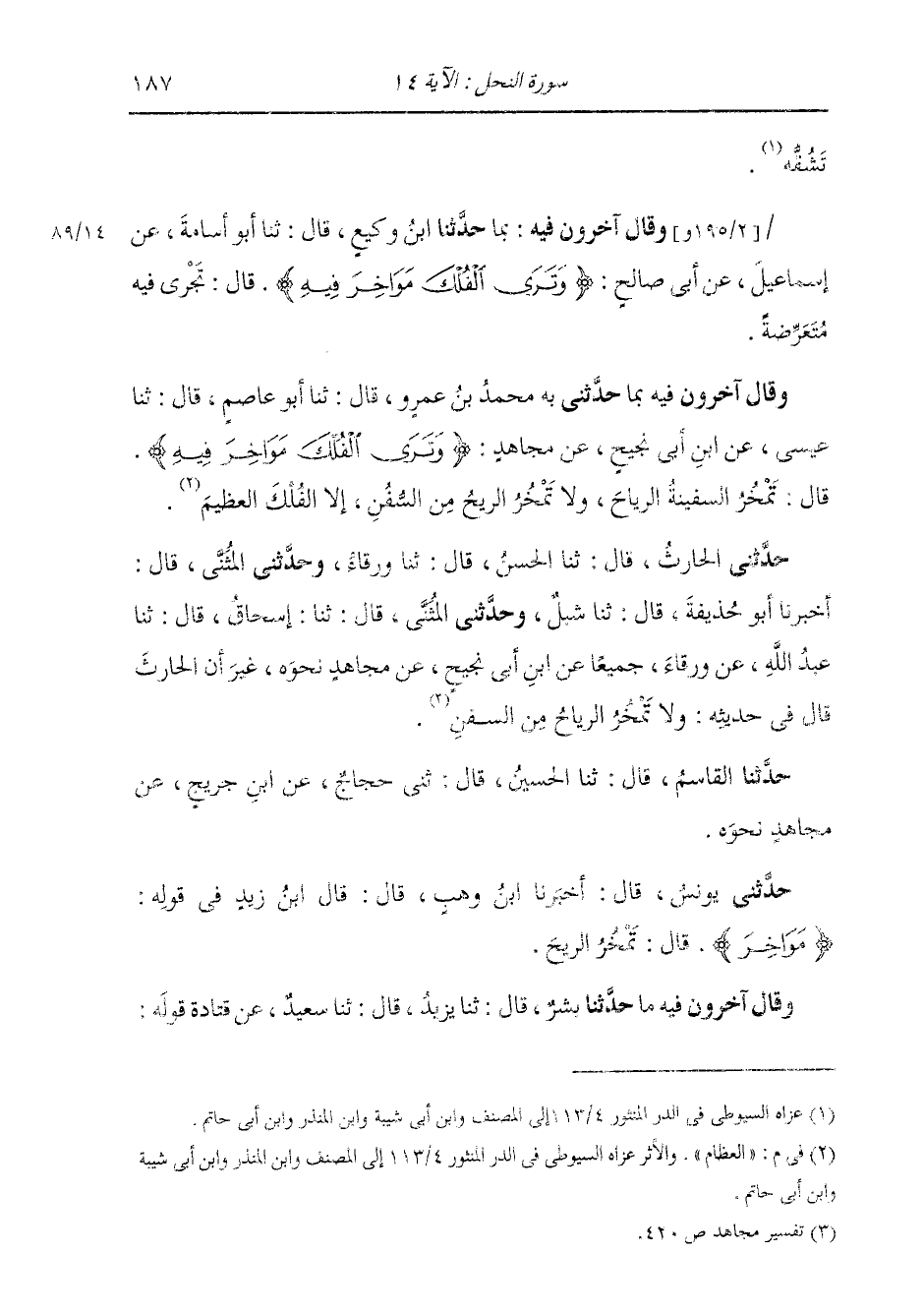 وَقَالَ آخَرُونَ فِيهِ بِمَا: حَدَّثَنِي بِهِ مُحَمَّدُ بْنُ عَمْرٍو قَالَ: ثنا أَبُو عَاصِمٍ، قَالَ: ثنا عِيسَى، عَنِ ابْنِ أَبِي نَجِيحٍ، عَنْ مُجَاهِدٍ: {§وَتَرَى الْفُلْكَ مَوَاخِرَ فِيهِ} [النحل: 14] قَالَ: «تَمْخُرُ السَّفِينَةُ الرِّيَاحَ، وَلَا تَمْخُرُ الرِّيحَ مِنَ السُّفُنِ إِلَّا الْفُلْكُ الْعِظَامُ» . حَدَّثَنِي الْحَرْثُ قَالَ: ثنا الْحَسَنُ قَالَ: ثنا وَرْقَاءُ، وَحَدَّثَنِي الْمُثَنَّى قَالَ: أَخْبَرَنَا أَبُو حُذَيْفَةَ قَالَ: ثنا شِبْلُ، وَحَدَّثَنِي الْمُثَنَّى قَالَ: ثنا إِسْحَاقُ قَالَ: ثنا عَبْدُ اللَّهِ، عَنْ وَرْقَاءَ جَمِيعًا، عَنِ ابْنِ أَبِي نَجِيحٍ، عَنْ مُجَاهِدٍ نَحْوَهُ، غَيْرَ أَنَّ الْحَرْثَ قَالَ فِي حَدِيثِهِ: وَلَا تُمْخَرُ الرِّيَاحُ مِنَ السُّفُنِ. حَدَّثَنَا الْقَاسِمُ قَالَ: ثنا الْحُسَيْنُ قَالَ: ثني حَجَّاجٌ، عَنِ ابْنِ جُرَيْجٍ، عَنْ مُجَاهِدٍ، نَحْوَهُ