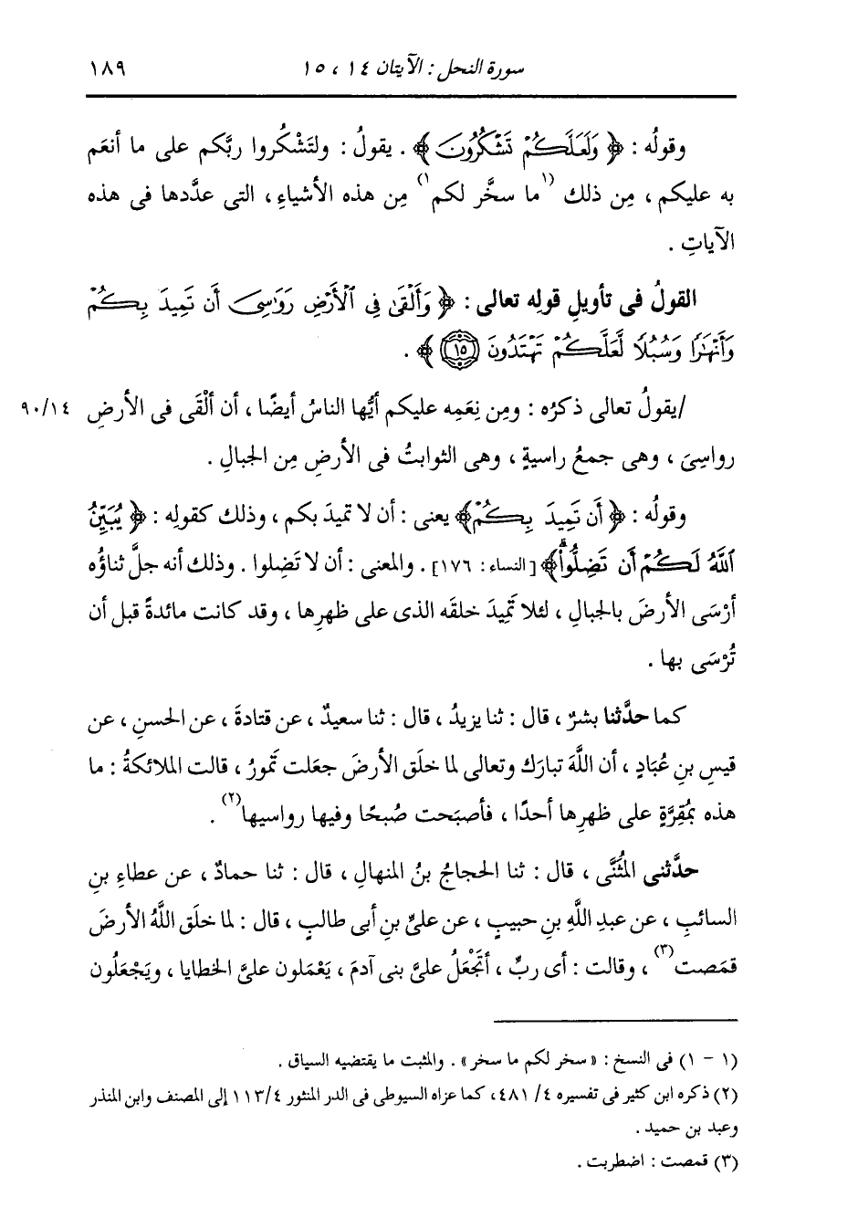 §الْقَوْلُ فِي تَأْوِيلِ قَوْلِهِ تَعَالَى: {وَأَلْقَى فِي الْأَرْضِ رَوَاسِيَ أَنْ تَمِيدَ بِكُمْ وَأَنْهَارًا وَسُبُلًا لَعَلَّكُمْ تَهْتَدُونَ} [النحل: 15] يَقُولُ تَعَالَى ذِكْرُهُ: وَمِنْ نِعَمِهِ عَلَيْكُمْ أَيُّهَا النَّاسُ أَيْضًا، أَنْ أَلْقَى فِي الْأَرْضِ رَوَاسِيَ، وَهِيَ جَمْعُ رَاسِيَةٍ، وَهِيَ الثَّوَابِتُ فِي الْأَرْضِ مِنَ الْجِبَالِ وَقَوْلُهُ: {أَنْ تَمِيدَ بِكُمْ} [النحل: 15] يَعْنِي: أَنْ لَا تَمِيدَ بِكُمْ، وَذَلِكَ كَقَوْلِهِ: {يُبَيِّنُ اللَّهُ لَكُمْ أَنْ تَضِلُّوا} [النساء: 176] وَالْمَعْنَى: أَنْ لَا تَضِلُّوا وَذَلِكَ أَنَّهُ جَلَّ ثَنَاؤُهُ أَرْسَى الْأَرْضَ بِالْجِبَالِ لِئَلَّا يَمِيدَ خَلْقُهُ الَّذِي عَلَى ظَهْرِهَا، بَلْ وَقَدْ كَانَتْ مَائِدَةً قَبْلَ أَنْ تُرْسَى بِهَا، كَمَا: