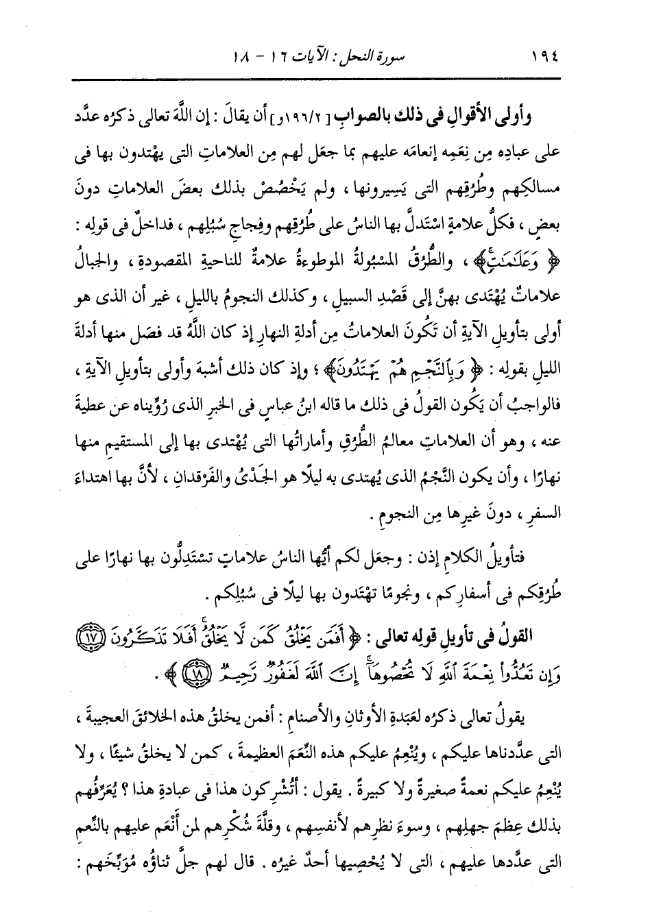 وَأَوْلَى الْأَقْوَالِ فِي ذَلِكَ بِالصَّوَابِ أَنْ يُقَالَ: إِنَّ اللَّهَ تَعَالَى ذِكْرُهُ عَدَّدَ عَلَى عِبَادِهِ مِنْ نِعَمِهِ، إِنْعَامَهُ عَلَيْهِمْ بِمَا جَعَلَ لَهُمْ مِنَ الْعَلَامَاتِ الَّتِي يَهْتَدُونَ بِهَا فِي مَسَالِكِهِمْ وَطُرُقِهِمُ الَّتِي يَسِيرُونَهَا، وَلَمْ يُخَصِّصْ بِذَلِكَ بَعْضَ الْعَلَامَاتِ دُونَ بَعْضٍ، فَكُلُّ عَلَامَةٍ اسْتَدَلَّ بِهَا النَّاسُ عَلَى طُرُقِهِمْ وَفِجَاجِ سُبُلِهِمْ فَدَاخِلٌ فِي قَوْلِهِ: {وَعَلَامَاتٍ} [النحل: 16] وَالطَّرْقُ الْمَسْبُولَةِ: الْمَوْطُوءَةِ، عَلَامَةٌ لِلنَّاحِيَةِ الْمَقْصُودَةِ، وَالْجِبَالُ عَلَامَاتٍ يَهْتَدِي بِهِنَّ إِلَى قَصْدِ السَّبِيلِ، وَكَذَلِكَ النُّجُومُ بِاللَّيْلِ غَيْرَ أَنَّ الَّذِيَ هُوَ أَوْلَى بِتَأْوِيلِ الْآيَةِ أَنْ تَكُونَ الْعَلَامَاتُ مِنْ أَدِلَّةِ النَّهَارِ، إِذْ كَانَ اللَّهُ قَدْ فَصَلَ مِنْهَا أَدِلَّةَ اللَّيْلِ بِقَوْلِهِ: {وَبِالنَّجْمِ هُمْ يَهْتَدُونَ} [النحل: 16] وَإِذَا كَانَ ذَلِكَ أَشْبَهُ وَأَوْلَى بِتَأْوِيلِ الْآيَةِ، فَالْوَاجِبُ أَنْ يَكُونَ الْقَوْلُ فِي ذَلِكَ مَا قَالَهُ ابْنُ عَبَّاسٍ فِي الْخَبَرِ الَّذِي رُوِّينَاهُ عَنْ عَطِيَّةَ عَنْهُ، وَهُوَ أَنَّ الْعَلَامَاتِ مَعَالِمُ الطُّرُقِ وَأَمَارَاتُهَا الَّتِي يُهْتَدَى بِهَا إِلَى الْمُسْتَقِيمِ مِنْهَا نَهَارًا، وَأَنْ يَكُونَ النَّجْمُ الَّذِي يُهْتَدَى بِهِ لَيْلًا هُوَ الْجَدْيُ وَالْفَرْقَدَانِ، لِأَنَّ بِهَا اهْتَدَاءَ السَّفَرِ دُونَ غَيْرِهَا مِنَ النُّجُومِ، فَتَأْوِيلُ الْكَلَامِ إِذَنْ: وَجَعَلَ لَكُمْ أَيُّهَا النَّاسُ عَلَامَاتٍ تَسْتَدِلُّونَ بِهَا نَهَارًا عَلَى طُرُقِكُمْ فِي أَسْفَارِكُمْ، وَنُجُومًا تَهْتَدُونَ بِهَا لَيْلًا فِي سُبُلِكُمْ