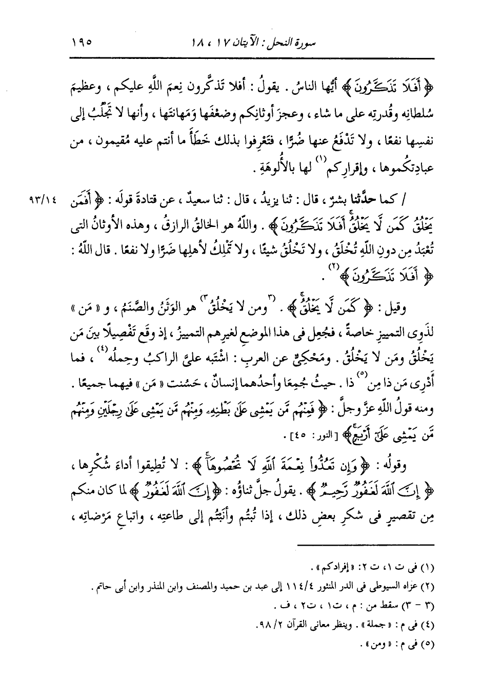 حَدَّثَنَا بِشْرٌ، قَالَ: ثنا يَزِيدُ، قَالَ: ثنا سَعِيدٌ، عَنْ قَتَادَةَ، قَوْلُهُ: " {§أَفَمَنْ يَخْلُقُ كَمَنْ لَا يَخْلُقُ أَفَلَا تَذَكَّرُونَ} [النحل: 17] وَاللَّهُ هُوَ الْخَالِقُ الرَّازِقُ، وَهَذِهِ الْأَوْثَانُ الَّتِي تُعْبَدُ مِنْ دُونِ اللَّهِ تُخْلَقُ وَلَا تَخْلُقُ شَيْئًا، وَلَا تَمْلِكُ لِأَهْلِهَا ضَرًّا وَلَا نَفْعًا، قَالَ اللَّهُ: {أَفَلَا تَذَكَّرُونَ} [النحل: 17] " وَقِيلَ: {كَمَنْ لَا يَخْلُقُ} [النحل: 17] هُوَ الْوَثَنُ وَالصَّنَمُ، وَ «مَنْ» لِذَوِي التَّمْيِيزِ خَاصَّةً، فَجَعَلَ فِي هَذَا الْمَوْضِعِ لِغَيْرِهِمْ لِلتَّمْيِيزِ، إِذْ وَقَعَ تَفْصِيلًا بَيْنَ مَنْ يَخْلُقُ وَمَنْ لَا يَخْلُقُ، وَمَحْكِيٌّ عَنِ الْعَرَبِ: اشْتَبَهَ عَلَيَّ الرَّاكِبُ وَجَمَلُهُ، فَمَا أَدْرِي مَنْ ذَا وَمَنْ ذَا، حَيْثُ جُمِعَا، وَأَحَدُهُمَا إِنْسَانٌ حَسُنَتْ «مَنْ» فِيهِمَا جَمِيعًا، وَمِنْهُ قَوْلُ اللَّهِ عَزَّ وَجَلَّ: {فَمِنْهُمْ مَنْ يَمْشِي عَلَى بَطْنِهِ، وَمِنْهُمْ مَنْ يَمْشِي عَلَى رِجْلَيْنِ، وَمِنْهُمْ مَنْ يَمْشِي عَلَى أَرْبَعٍ} [النور: 45]