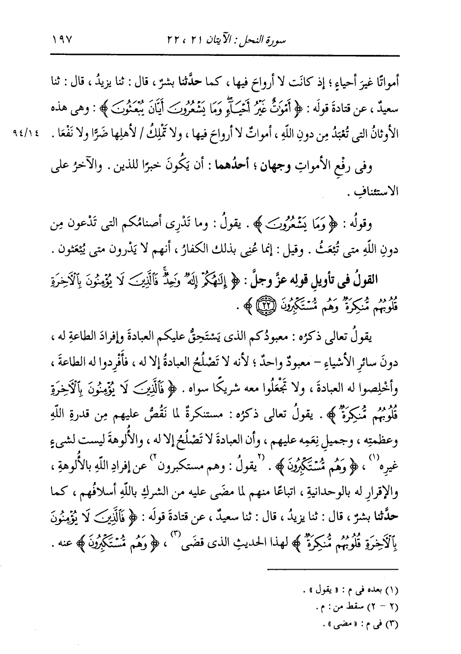 حَدَّثَنَا بِشْرٌ، قَالَ: ثنا يَزِيدُ، قَالَ: ثنا سَعِيدٌ، عَنْ قَتَادَةَ، قَوْلُهُ: {§أَمْوَاتٌ غَيْرُ أَحْيَاءٍ وَمَا يَشْعُرُونَ أَيَّانَ يُبْعَثُونَ} [النحل: 21] «وَهِيَ هَذِهِ الْأَوْثَانُ الَّتِي تُعْبَدُ مِنْ دُونِ اللَّهِ أَمْوَاتٌ لَا أَرْوَاحَ فِيهَا، وَلَا تَمْلِكُ لِأَهْلِهَا ضَرًّا وَلَا نَفْعًا» . وَفِي رَفْعِ الْأَمْوَاتِ وَجْهَانِ: أَحَدُهُمَا أَنْ يَكُونَ خَبَرًا لِلَّذِينَ، وَالْآخَرُ عَلَى الِاسْتِئْنَافِ