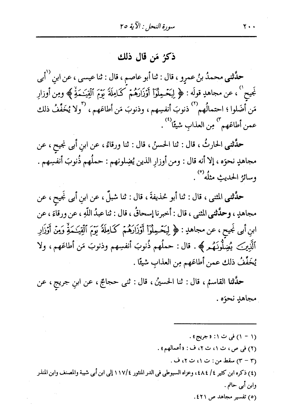 حَدَّثَنِي الْمُثَنَّى قَالَ: ثنا أَبُو حُذَيْفَةَ قَالَ: ثنا شِبْلٌ، عَنِ ابْنِ أَبِي نَجِيحٍ، عَنْ مُجَاهِدٍ، وَحَدَّثَنِي الْمُثَنَّى قَالَ: أَخْبَرَنَا إِسْحَاقُ قَالَ: ثنا عَبْدُ اللَّهِ، عَنْ وَرْقَاءَ، عَنِ ابْنِ أَبِي نَجِيحٍ، عَنْ مُجَاهِدٍ: {§لِيَحْمِلُوا أَوْزَارَهُمْ} [النحل: 25] كَامِلَةً يَوْمَ الْقِيَامَةِ وَمِنْ أَوْزَارِ الَّذِينَ يُضِلُّونَهُمْ قَالَ: «حَمْلُهُمْ ذُنُوبَ أَنْفُسِهِمْ وَذُنُوبَ مَنْ أَطَاعَهُمْ، وَلَا يُخَفِّفُ ذَلِكَ عَمَّنْ أَطَاعَهُمْ مِنَ الْعَذَابِ شَيْئًا» . حَدَّثَنَا الْقَاسِمُ قَالَ: ثنا الْحُسَيْنُ قَالَ: ثني حَجَّاجٌ، عَنِ ابْنِ جُرَيْجٍ، عَنْ مُجَاهِدٍ، نَحْوَهُ