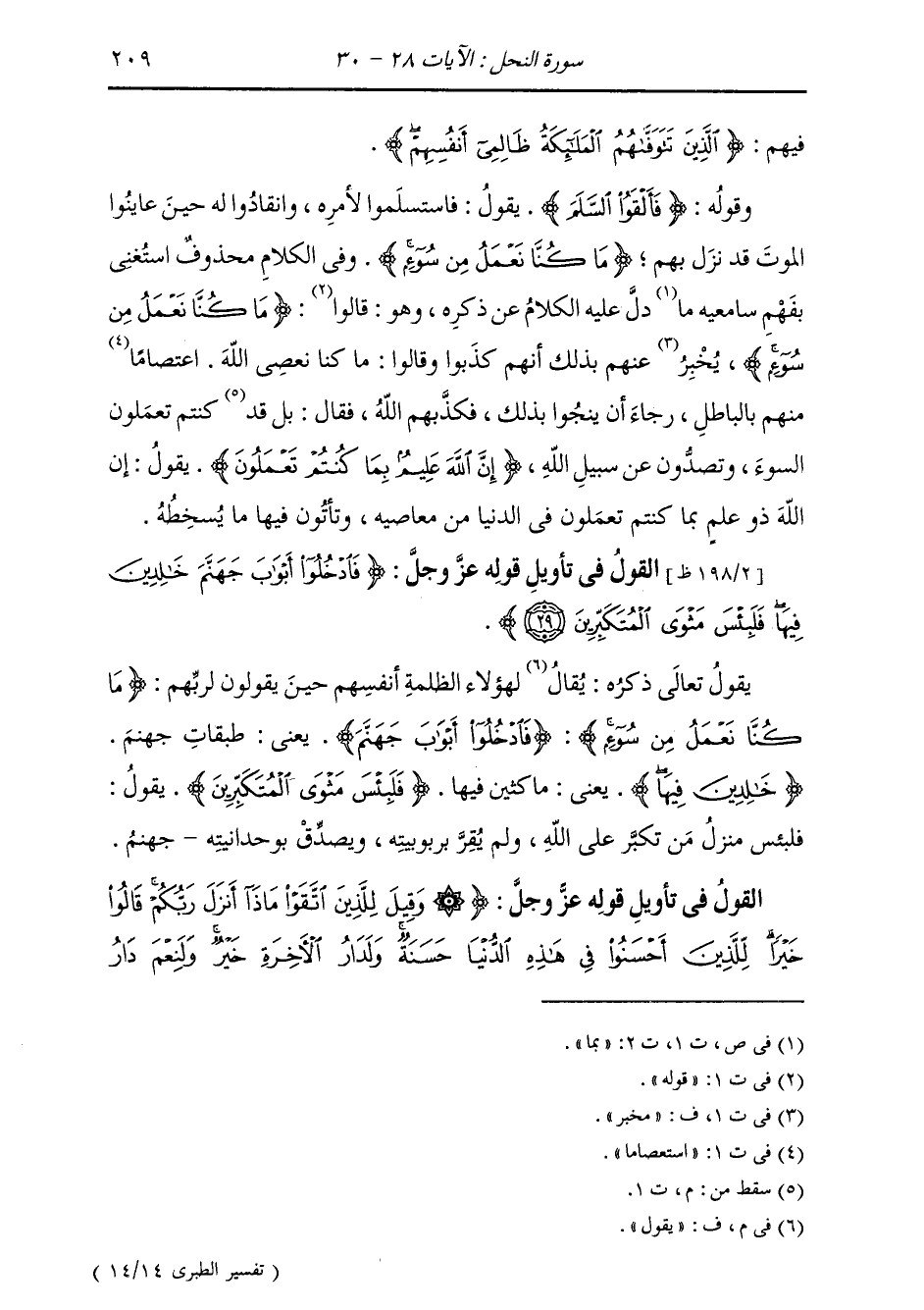 §الْقَوْلُ فِي تَأْوِيلِ قَوْلِهِ تَعَالَى: {فَادْخُلُوا أَبْوَابَ جَهَنَّمَ خَالِدِينَ فِيهَا فَلَبِئْسَ مَثْوَى الْمُتَكَبِّرِينَ} [النحل: 29] يَقُولُ تَعَالَى ذِكْرُهُ، يَقُولُ لِهَؤُلَاءِ الظَّلَمَةِ أَنْفُسِهِمْ حِينَ يَقُولُونَ لِرَبِّهِمْ: مَا كُنَّا نَعْمَلُ مِنْ سُوءٍ: ادْخُلُوا أَبْوَابَ جَهَنَّمَ، يَعْنِي: طَبَقَاتِ جَهَنَّمَ، {خَالِدِينَ فِيهَا} [البقرة: 162] يَعْنِي: مَاكِثِينَ فِيهَا، {فَلَبِئْسَ مَثْوَى الْمُتَكَبِّرِينَ} [النحل: 29] يَقُولُ: فَلَبِئْسَ مَنْزِلُ مَنْ تَكَبَّرَ عَلَى اللَّهِ، وَلَمْ يُقِرَّ بِرُبُوبِيَّتِهِ، وَيُصَدِّقْ بِوَحْدَانِيَّتِهِ {جَهَنَّمُ} [البقرة: 206]