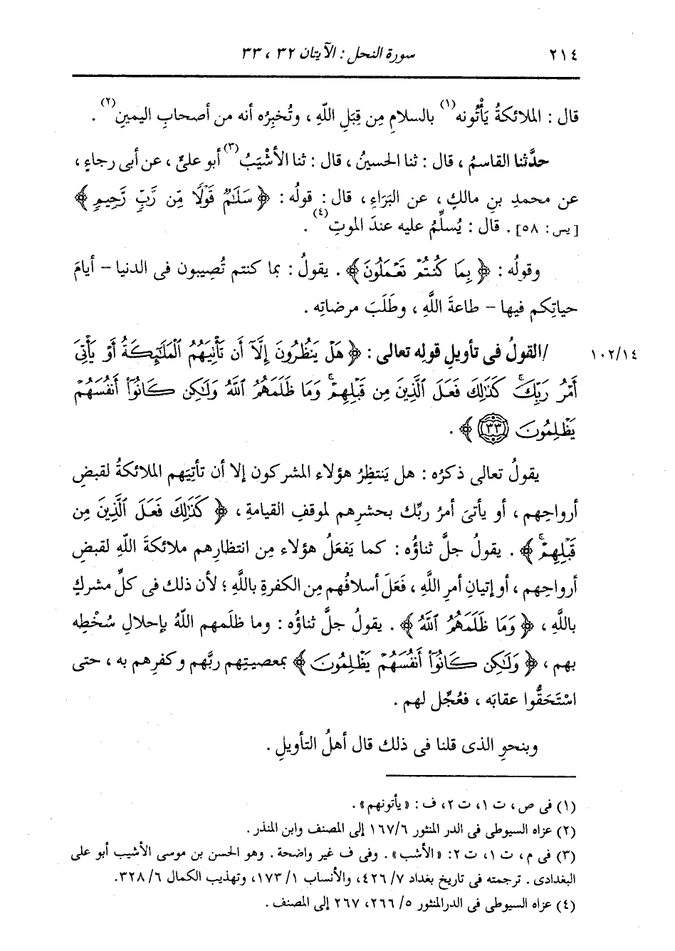 §الْقَوْلُ فِي تَأْوِيلِ قَوْلِهِ تَعَالَى: {هَلْ يَنْظُرُونَ إِلَّا أَنْ تَأْتِيَهُمُ الْمَلَائِكَةُ، أَوْ يَأْتِي أَمْرُ رَبِّكَ، كَذَلِكَ فَعَلَ الَّذِينَ مِنْ قَبْلِهِمْ، وَمَا ظَلَمَهُمُ اللَّهُ، وَلَكِنْ كَانُوا أَنْفُسَهُمْ يَظْلِمُونَ} [النحل: 33] يَقُولُ تَعَالَى ذِكْرُهُ: هَلْ يَنْتَظِرُ هَؤُلَاءِ الْمُشْرِكُونَ إِلَّا أَنْ تَأْتِيَهُمُ الْمَلَائِكَةُ لَقَبْضِ أَرْوَاحِهِمْ، أَوْ يَأْتِيَ أَمْرُ رَبِّكَ بِحَشْرِهِمْ لِمَوْقِفِ الْقِيَامَةِ {كَذَلِكَ فَعَلَ الَّذِينَ مِنْ قَبْلِهِمْ} [النحل: 33] يَقُولُ جَلَّ ثَنَاؤُهُ: كَمَا يَفْعَلُ هَؤُلَاءِ مِنِ انْتِظَارِهِمْ مَلَائِكَةَ اللَّهِ لِقَبْضِ أَرْوَاحِهِمْ، أَوْ إِتْيَانِ أَمْرِ اللَّهِ فِعْلَ أَسْلَافِهِمْ مِنَ الْكَفَرَةِ بِاللَّهِ، لِأَنَّ ذَلِكَ فِي كُلِّ مُشْرِكٍ بِاللَّهِ {وَمَا ظَلَمَهُمُ اللَّهُ} [آل عمران: 117] يَقُولُ جَلَّ ثَنَاؤُهُ: وَمَا ظَلَمَهُمُ اللَّهُ بِإِحْلَالِ سَخَطِهِ، {وَلَكِنْ كَانُوا أَنْفُسَهُمْ يَظْلِمُونَ} [البقرة: 57] بِمَعْصِيَتِهِمْ رَبَّهُمْ وَكُفْرِهِمْ بِهِ، حَتَّى اسْتَحَقُّوا عِقَابَهُ، فَعَجَّلَ لَهُمْ. وَبِنَحْوِ الَّذِي قُلْنَا فِي ذَلِكَ قَالَ أَهْلُ التَّأْوِيلِ