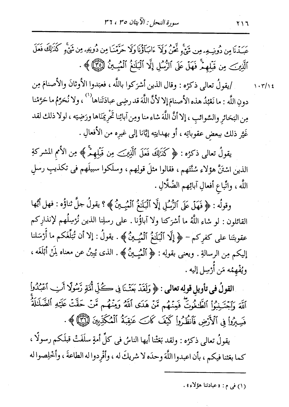 §وَقَوْلُهُ: {فَهَلْ عَلَى الرُّسُلِ إِلَّا الْبَلَاغُ الْمُبِينُ} [النحل: 35] يَقُولُ جَلَّ ثَنَاؤُهُ: فَهَلْ أَيُّهَا الْقَائِلُونَ لَوْ شَاءَ اللَّهُ مَا أَشْرَكْنَا وَلَا آبَاؤُنَا عَلَى رُسُلِنَا الَّذِينَ نُرْسِلُهُمْ بِإِنْذَارِكُمْ عُقُوبَتَنَا عَلَى كُفْرِكُمْ، إِلَّا الْبَلَاغُ الْمُبِينُ، يَقُولُ: إِلَّا أَنْ تُبَلِّغَكُمْ مَا أَرْسَلْنَا إِلَيْكُمْ مِنَ الرِّسَالَةِ وَيَعْنِي بِقَوْلِهِ {الْمُبِينُ} [المائدة: 92] الَّذِي يُبِينُ عَنْ مَعْنَاهُ لِمَنْ أُبْلِغَهُ، وَيَفْهَمُهُ مَنْ أُرْسِلَ إِلَيْهِ