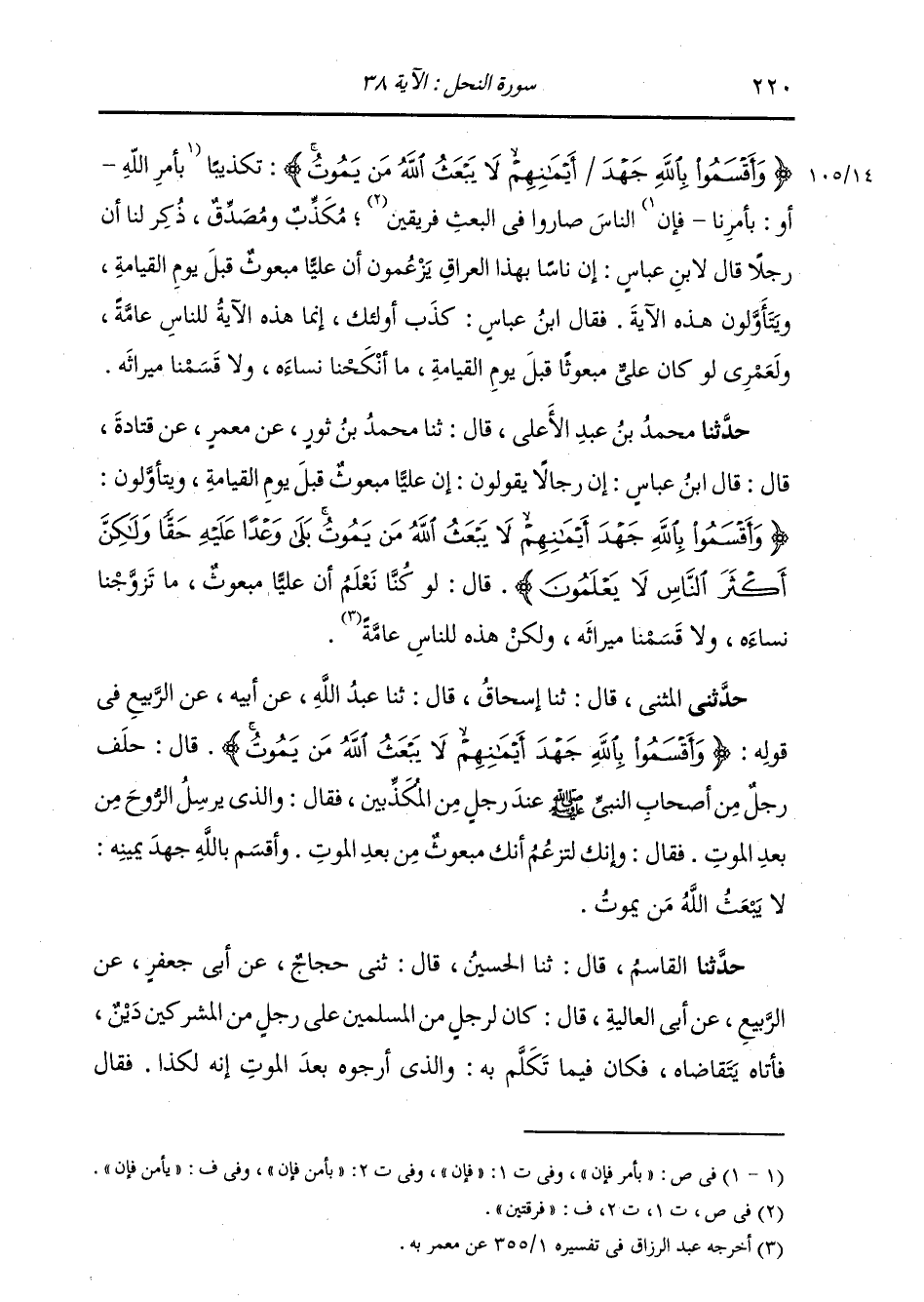 حَدَّثَنَا مُحَمَّدُ بْنُ عَبْدِ الْأَعْلَى، قَالَ: ثنا مُحَمَّدُ بْنُ ثَوْرٍ، عَنْ مَعْمَرٍ، عَنْ قَتَادَةَ، قَالَ: قَالَ ابْنُ عَبَّاسٍ: " إِنَّ رِجَالًا يَقُولُونَ: إِنَّ عَلِيًّا مَبْعُوثٌ قَبْلَ يَوْمِ الْقِيَامَةِ، وَيَتَأَوَّلُونَ: {وَأَقْسَمُوا بِاللَّهِ جَهْدَ أَيْمَانِهِمْ لَا يَبْعَثُ اللَّهُ مَنْ يَمُوتُ، بَلَى وَعْدًا عَلَيْهِ حَقًّا وَلَكِنَّ أَكْثَرَ النَّاسِ لَا يَعْلَمُونَ} [النحل: 38] قَالَ: «§لَوْ كُنَّا نَعْلَمُ أَنَّ عَلِيًّا مَبْعُوثٌ، مَا تَزَوَّجْنَا نِسَاءَهُ، وَلَا قَسَمْنَا مِيرَاثَهُ، وَلَكِنْ هَذِهِ لِلنَّاسِ عَامَّةً»