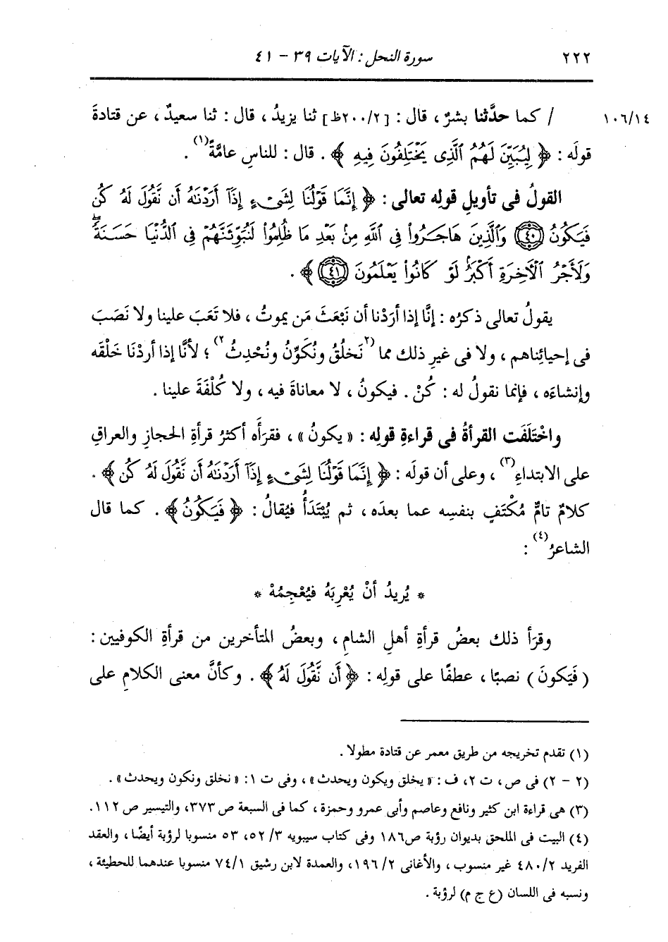 §الْقَوْلُ فِي تَأْوِيلِ قَوْلِهِ تَعَالَى {إِنَّمَا قَوْلُنَا لِشَيْءٍ إِذَا أَرَدْنَاهُ أَنْ نَقُولَ لَهُ كُنْ فَيَكُونُ. وَالَّذِينَ هَاجَرُوا فِي اللَّهِ مِنْ بَعْدِ مَا ظُلِمُوا لَنُبَوِّئَنَّهُمْ فِي الدُّنْيَا حَسَنَةً، وَلَأَجْرُ الْآخِرَةِ أَكْبَرُ لَوْ كَانُوا يَعْلَمُونَ} [النحل: 41] يَقُولُ تَعَالَى ذِكْرُهُ: إِنَّا إِذَا أَرَدْنَا أَنْ نَبْعَثَ مَنْ يَمُوتُ فَلَا تَعَبَ عَلَيْنَا وَلَا نَصَبَ فِي إِحْيَائِنَاهُمْ، وَلَا فِي غَيْرِ ذَلِكَ مِمَّا نُخْلُقُ وَنُكَوِّنُ وَنُحْدِثُ، لِأَنَّا إِذَا أَرَدْنَا خَلْقَهُ وَإِنْشَاءَهُ فَإِنَّمَا نَقُولُ لَهُ كُنْ فَيَكُونُ، لَا مُعَانَاةَ فِيهِ وَلَا كُلْفَةَ عَلَيْنَا. وَاخْتَلَفَتِ الْقُرَّاءُ فِي قِرَاءَةِ قَوْلِهِ: {يَكُونُ} [البقرة: 150] ، فَقَرَأَهُ أَكْثَرُ قُرَّاءِ الْحِجَازِ وَالْعِرَاقِ عَلَى الِابْتِدَاءِ، وَعَلَى أَنَّ قَوْلَهُ: {إِنَّمَا قَوْلُنَا لِشَيْءٍ إِذَا أَرَدْنَاهُ أَنْ نَقُولَ لَهُ كُنْ} [النحل: 40] كَلَامٌ تَامٌّ مُكْتَفٍ بِنَفْسِهِ عَمَّا بَعْدَهُ، ثُمَّ يُبْتَدَأُ فَيُقَالُ: «فَيَكُونُ» ، كَمَا قَالَ الشَّاعِرُ: