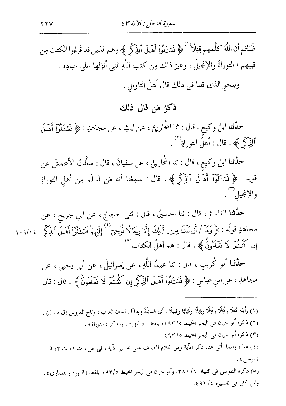 ذِكْرُ مَنْ قَالَ ذَلِكَ: حَدَّثَنَا ابْنُ وَكِيعٍ، قَالَ: ثنا الْمُحَارِبِيُّ، عَنْ لَيْثٍ، عَنْ مُجَاهِدٍ: {§فَاسْأَلُوا أَهْلَ الذِّكْرِ} [النحل: 43] قَالَ: «أَهْلُ التَّوْرَاةِ»