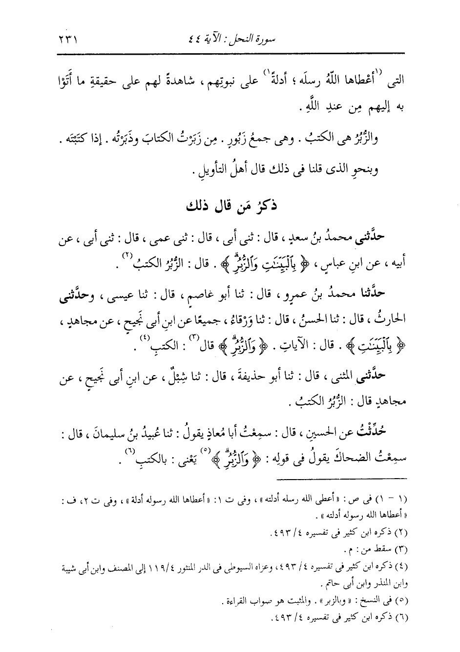 حَدَّثَنِي الْمُثَنَّى، قَالَ: ثنا أَبُو حُذَيْفَةَ، قَالَ: ثنا شِبْلٌ، عَنِ ابْنِ أَبِي نَجِيحٍ، عَنْ مُجَاهِدٍ، قَالَ: " §الزُّبُرُ: الْكُتُبُ "