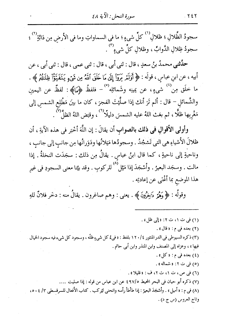 حَدَّثَنِي مُحَمَّدُ بْنُ سَعْدٍ، قَالَ: ثني أَبِي قَالَ: ثني عَمِّي قَالَ: ثني أَبِي عَنْ أَبِيهِ، عَنِ ابْنِ عَبَّاسٍ، قَوْلُهُ: {§أَوَلَمْ يَرَوْا إِلَى مَا خَلَقَ اللَّهُ مِنْ شَيْءٍ يَتَفَيَّأُ ظِلَالُهُ} «مَا خَلَقَ مِنْ كُلِّ شَيْءٍ عَنْ يَمِينِهِ وَشَمَائِلِهِ، فَلَفْظُ» مَا " لَفْظٌ عَنِ الْيَمِينِ وَالشَّمَائِلِ، قَالَ: أَلَمْ تَرَ أَنَّكَ إِذَا صَلَّيْتَ الْفَجْرَ كَانَ مَا بَيْنَ مَطْلَعِ الشَّمْسِ إِلَى مَغْرِبِهَا ظِلًّا؟ ثُمَّ بَعَثَ اللَّهُ عَلَيْهِ الشَّمْسَ دَلِيلًا، وَقَبَضَ اللَّهُ الظِّلَّ " وَأَوْلَى الْأَقْوَالِ فِي ذَلِكَ بِالصَّوَابِ أَنْ يُقَالَ: إِنَّ اللَّهَ أَخْبَرَ فِي هَذِهِ الْآيَةِ أَنَّ ظِلَالَ الْأَشْيَاءِ هِيَ الَّتِي تَسْجُدُ، وَسُجُودُهَا: مَيَلَانُهَا وَدَوَرَانُهَا مِنْ جَانِبٍ إِلَى جَانِبٍ، وَنَاحِيَةٍ إِلَى نَاحِيَةٍ، كَمَا قَالَ ابْنُ عَبَّاسٍ، يُقَالُ مِنْ ذَلِكَ: سَجَدَتِ النَّخْلَةُ إِذَا مَالَتْ، وَسَجَدَ الْبَعِيرُ وَأُسْجِدَ: إِذَا أُمِيلَ لِلرُّكُوبِ، وَقَدْ بَيَّنَّا مَعْنَى السُّجُودِ فِي غَيْرِ هَذَا الْمَوْضِعِ بِمَا أَغْنَى عَنْ إِعَادَتِهِ