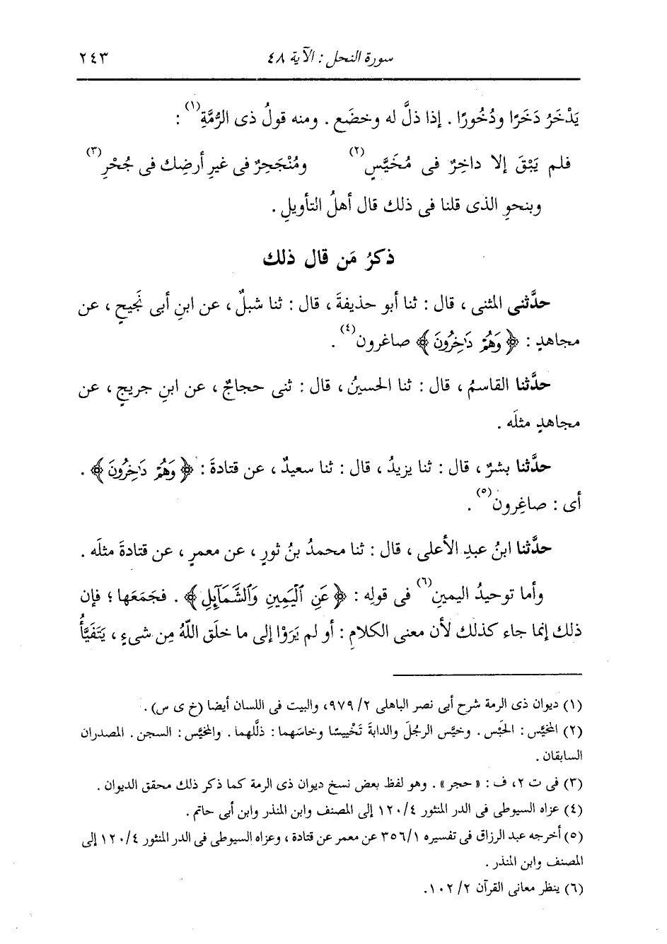 حَدَّثَنَا بِشْرٌ، قَالَ: ثنا يَزِيدُ، قَالَ: ثنا سَعِيدٌ، عَنْ قَتَادَةَ: " {§وَهُمْ دَاخِرُونَ} [النحل: 48] أَيْ صَاغِرُونَ ". حَدَّثَنَا ابْنُ عَبْدِ الْأَعْلَى، قَالَ: ثنا مُحَمَّدُ بْنُ ثَوْرٍ، عَنْ مَعْمَرٍ، عَنْ قَتَادَةَ، مِثْلَهُ. وَأَمَّا تَوْحِيدُ الْيَمِينِ فِي قَوْلِهِ: {عَنِ الْيَمِينِ وَالشَّمَائِلِ} [النحل: 48] فَجَمَعَهَا، فَإِنَّ ذَلِكَ إِنَّمَا جَاءَ كَذَلِكَ، لِأَنَّ مَعْنَى الْكَلَامِ: أَوَلَمْ يَرَوْا إِلَى مَا خَلَقَ اللَّهُ مِنْ شَيْءٍ يَتَفَيَّأُ -[244]- ظِلَالُ مَا خَلَقَ مِنْ شَيْءٍ عَنْ يَمِينِهِ: أَيْ مَا خَلَقَ، وَشَمَائِلِهِ، فَلَفْظُ «مَا» لَفْظٌ وَاحِدٌ، وَمَعْنَاهُ مَعْنَى الْجَمْعِ، فَقَالَ: «عَنْ الْيَمِينِ» بِمَعْنَى: عَنْ يَمِينِ مَا خَلَقَ، ثُمَّ رَجَعَ إِلَى مَعْنَاهُ فِي الشَّمَائِلِ، وَكَانَ بَعْضُ أَهْلِ الْعَرَبِيَّةِ يَقُولُ: إِنَّمَا تَفْعَلُ الْعَرَبُ ذَلِكَ؛ لِأَنَّ أَكْثَرَ الْكَلَامِ مُوَاجَهَةُ الْوَاحِدِ الْوَاحِدَ، فَيُقَالُ لِلرَّجُلِ: خُذْ عَنْ يَمِينِكَ، قَالَ: فَكَأَنَّهُ إِذَا وَحَّدَ ذَهَبَ إِلَى وَاحِدٍ مِنَ الْقَوْمِ، وَإِذَا جَمَعَ فَهُوَ الَّذِي لَا مُسَاءَلَةَ فِيهِ، وَاسْتَشْهَدَ لِفِعْلِ الْعَرَبِ ذَلِكَ بِقَوْلِ الشَّاعِرِ: