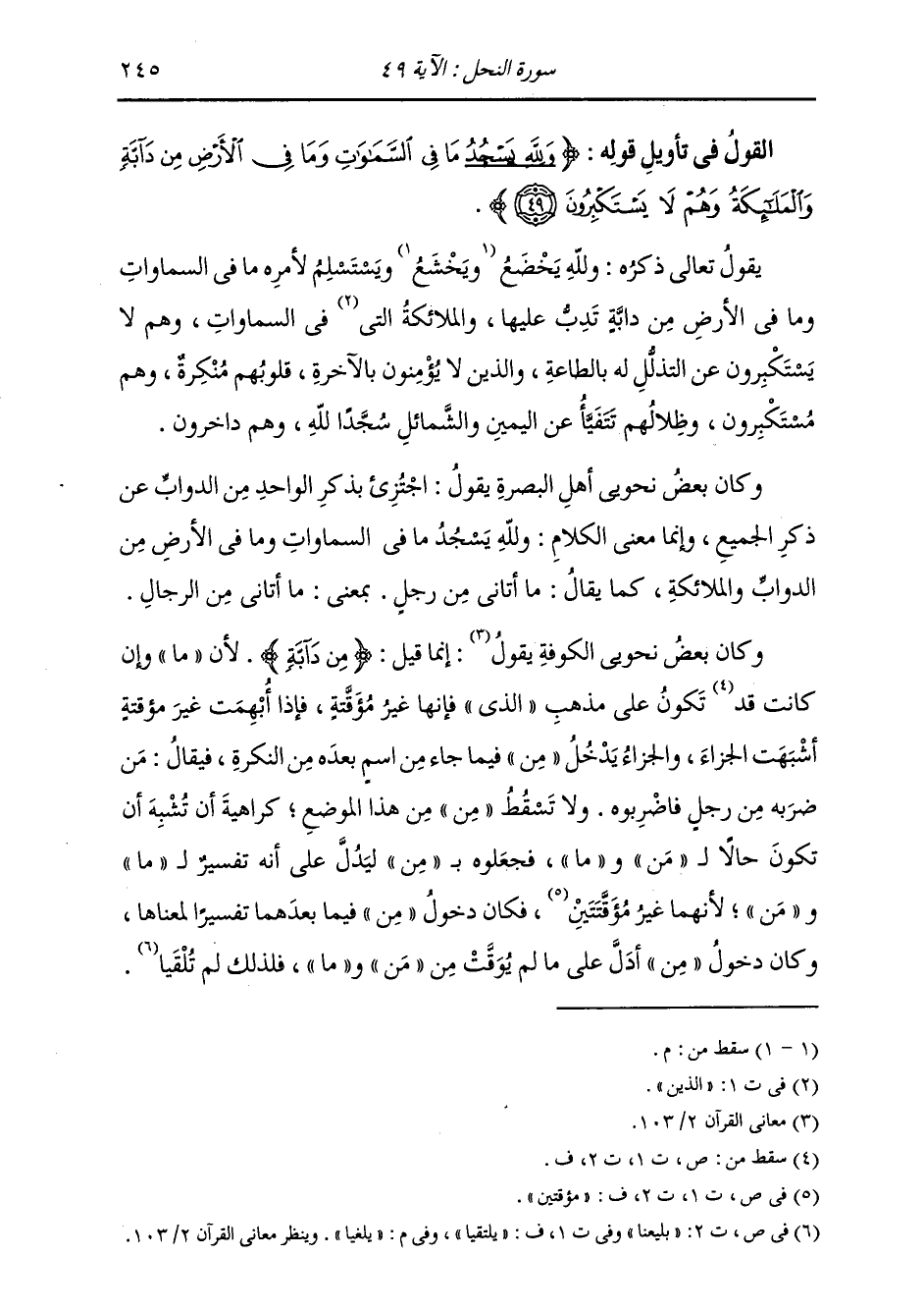 §الْقَوْلُ فِي تَأْوِيلِ قَوْلِهِ تَعَالَى: {وَلِلَّهِ يَسْجُدُ مَا فِي السَّمَوَاتِ وَمَا فِي الْأَرْضِ مِنْ دَابَّةٍ وَالْمَلَائِكَةُ وَهُمْ لَا يَسْتَكْبِرُونَ} يَقُولُ تَعَالَى ذِكْرُهُ: وَلِلَّهِ يَخْضَعُ وَيَسْتَسْلِمُ لَأَمْرِهِ مَا فِي السَّمَاوَاتِ وَمَا فِي الْأَرْضِ مِنْ دَابَّةٍ يَدِبُّ عَلَيْهَا، وَالْمَلَائِكَةُ الَّتِي فِي السَّمَاوَاتِ، وَهُمْ لَا يَسْتَكْبِرُونَ عَنِ التَّذَلُّلِ لَهُ بِالطَّاعَةِ {فَالَّذِينَ لَا يُؤْمِنُونَ بِالْآخِرَةِ قُلُوبُهُمْ مُنْكِرَةٌ وَهُمْ مُسْتَكْبِرُونَ} [النحل: 22] وَظِلَالُهُمْ تَتَفَيَّأُ عَنِ الْيَمِينِ، وَالشَّمَائِلِ سُجَّدًا للَّهِ وَهُمْ دَاخِرُونَ. وَكَانَ بَعْضُ نَحْوِيِّي الْبَصْرَةِ يَقُولُ: اجْتُزِئَ بِذِكْرِ الْوَاحِدِ مِنَ الدَّوَابِّ عَنْ ذِكْرِ الْجَمِيعِ، وَإِنَّمَا مَعْنَى الْكَلَامِ: وَلِلَّهِ يَسْجُدُ مَا فِي السَّمَاوَاتِ وَمَا فِي الْأَرْضِ مِنَ الدَّوَابِّ وَالْمَلَائِكَةِ، كَمَا يُقَالُ: مَا أَتَانِي مِنْ رَجُلٍ، بِمَعْنَى: مَا أَتَانِي مِنَ الرِّجَالِ. وَكَانَ بَعْضُ نَحْوِيِّيِ الْكُوفَةِ يَقُولُ: إِنَّمَا قِيلَ: مِنْ دَابَّةٍ؛ لِأَنَّ «مَا» وَإِنْ كَانَتْ قَدْ تَكُونُ عَلَى مَذْهَبِ الَّذِي، فَإِنَّهَا غَيْرُ مُؤَقَّتَةٍ، فَإِذَا أُبْهِمَتْ غَيْرَ مُؤَقَّتَةٍ أَشْبَهَتِ الْجَزَاءَ، وَالْجَزَاءُ يُدْخِلُ مِنْ فِيمَا جَاءَ مِنَ اسْمٍ بَعْدَهُ مِنَ النَّكِرَةِ، فَيُقَالُ: مَنْ ضَرَبَهُ مِنْ رَجُلٍ فَاضْرِبُوهُ، وَلَا تَسْقُطُ «مِنْ» مِنْ هَذَا الْمَوْضِعِ كَرَاهِيَةَ أَنْ تُشْبِهَ أَنْ تَكُونَ حَالًا لِـ «مَنْ» وَ «مَا» ، فَجَعَلُوهُ بِمِنْ لِيَدُلَّ عَلَى أَنَّهُ تَفْسِيرٌ لِمَا وَمَنْ؛ لِأَنَّهُمَا غَيْرُ مُؤَقَّتَتَيْنِ، فَكَانَ دُخُولُ مِنْ فِيمَا بَعْدَهُمَا تَفْسِيرًا لِمَعْنَاهُمَا، وَكَانَ دُخُولُ مِنْ أَدَلُّ عَلَى مَا لَمْ يُوَقَّتْ مِنْ «مَنْ وَمَا» ، فَلِذَلِكَ لَمْ تُلْغَيَا