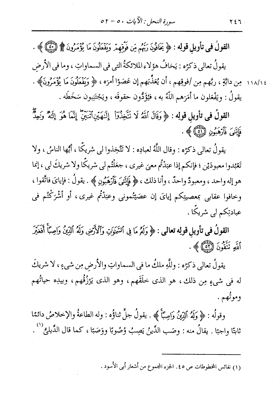 §الْقَوْلُ فِي تَأْوِيلِ قَوْلِهِ تَعَالَى: {يَخَافُونَ رَبَّهُمْ مِنْ فَوْقِهِمْ وَيَفْعَلُونَ مَا يُؤْمَرُونَ} [النحل: 50] يَقُولُ تَعَالَى ذِكْرُهُ: يَخَافُ هَؤُلَاءِ الْمَلَائِكَةُ الَّتِي فِي السَّمَاوَاتِ وَمَا فِي الْأَرْضِ مِنْ دَابَّةٍ رَبَّهُمْ مِنْ فَوْقِهِمْ أَنْ يُعَذِّبَهُمْ إِنْ عَصَوْا أَمْرَهُ {وَيَفْعَلُونَ مَا يُؤْمَرُونَ} [النحل: 50] يَقُولُ: وَيَفْعَلُونَ مَا أَمَرَهُمُ اللَّهُ بِهِ، فَيُؤَدُّونَ حُقُوقَهُ، وَيَجْتَنِبُونَ سَخَطَهُ