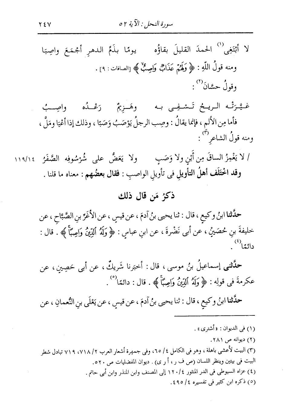 ذِكْرُ مَنْ قَالَ ذَلِكَ: حَدَّثَنَا ابْنُ وَكِيعٍ، قَالَ: ثنا يَحْيَى بْنُ آدَمَ، عَنْ قَيْسٍ، عَنِ الْأَغَرِّ بْنِ الصَّبَّاحِ، عَنْ خَلِيفَةَ بْنِ حُصَيْنٍ، عَنْ أَبِي نَضْرَةَ، عَنِ ابْنِ عَبَّاسٍ: {§وَلَهُ الدِّينُ وَاصِبًا} [النحل: 52] قَالَ: «دَائِمًا»