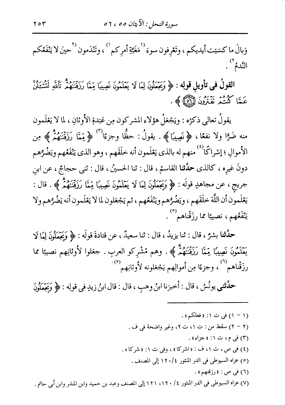§الْقَوْلُ فِي تَأْوِيلِ قَوْلِهِ تَعَالَى: {وَيَجْعَلُونَ لِمَا لَا يَعْلَمُونَ نَصِيبًا مِمَّا رَزَقْنَاهُمْ، تَاللَّهِ لَتُسْأَلُنَّ عَمَّا كُنْتُمْ تَفْتَرُونَ} [النحل: 56] يَقُولُ تَعَالَى ذِكْرُهُ: وَيَجْعَلُ هَؤُلَاءِ الْمُشْرِكُونَ مِنْ عَبْدَةِ الْأَوْثَانَ لِمَا لَا يَعْلَمُونَ مِنْهُ ضَرًّا وَلَا نَفْعًا {نَصِيبًا} [آل عمران: 23] يَقُولُ: حَظًّا وَجَزَاءً مِمَّا رَزَقْنَاهُمْ مِنَ الْأَمْوَالِ، إِشْرَاكًا مِنْهُمْ لَهُ، الَّذِي يَعْلَمُونَ أَنَّهُ خَلَقَهُمْ، وَهُوَ الَّذِي يَنْفَعُهُمْ وَيَضُرُّهُمْ دُونَ غَيْرِهِ، كَالَّذِي: