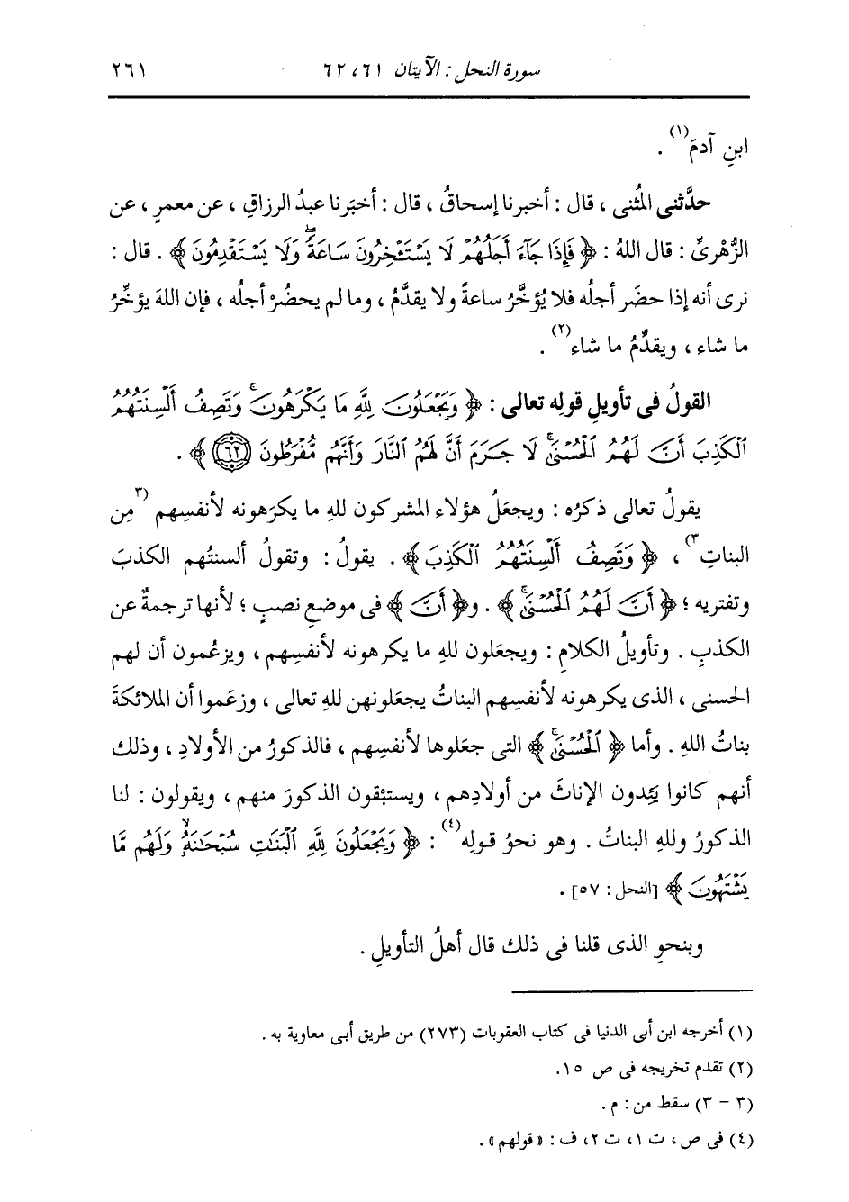§الْقَوْلُ فِي تَأْوِيلِ قَوْلِهِ تَعَالَى: {وَيَجْعَلُونَ للَّهِ مَا يَكْرَهُونَ وَتَصِفُ أَلْسِنَتُهُمُ الْكَذِبَ أَنَّ لَهُمُ الْحُسْنَى لَا جَرَمَ أَنَّ لَهُمُ النَّارَ وَأَنَّهُم مُّفَرِّطُونَ} [النحل: 62] يَقُولُ تَعَالَى ذِكْرُهُ: وَيَجْعَلُ هَؤُلَاءِ الْمُشْرِكُونَ للَّهِ مَا يَكْرَهُونَهُ لِأَنْفُسِهِمْ {وَتَصِفُ أَلْسِنَتُهُمُ الْكَذِبَ} [النحل: 62] يَقُولُ: وَتَقُولُ أَلْسِنَتُهُمُ الْكَذِبَ وَتَفْتَرِيهِ {أَنَّ لَهُمُ الْحُسْنَى} [النحل: 62] فَأَنَّ فِي مَوْضِعِ نَصْبٍ، لِأَنَّهَا تَرْجَمَةٌ عَنِ الْكَذِبِ وَتَأْوِيلُ الْكَلَامِ: وَيَجْعَلُونَ للَّهِ مَا يَكْرَهُونَهُ لِأَنْفُسِهِمْ، وَيَزْعُمُونَ أَنَّ لَهُمُ الْحُسْنَى الَّذِي يَكْرَهُونَهُ لِأَنْفُسِهِمْ، الْبَنَاتُ يَجْعَلُونَهُنَّ للَّهِ تَعَالَى، وَزَعَمُوا أَنَّ الْمَلَائِكَةَ بَنَاتُ اللَّهِ، وَأَمَّا الْحُسْنَى الَّتِي جَعَلُوهَا لِأَنْفُسِهِمْ: فَالذُّكُورُ مِنَ الْأَوْلَادِ، وَذَلِكَ أَنَّهُمْ كَانُوا يَئِدُونَ الْإِنَاثَ مِنْ أَوْلَادِهِمْ وَيَسْتَبْقُونَ الذُّكُورَ مِنْهُمْ، وَيَقُولُونَ: لَنَا الذُّكُورُ وَلِلَّهِ الْبَنَاتُ، وَهُوَ نَحْوَ قَوْلِهِ: {وَيَجْعَلُونَ للَّهِ الْبَنَاتِ سُبْحَانَهُ وَلَهُمْ مَا يَشْتَهُونَ} [النحل: 57] وَبِنَحْوِ الَّذِي قُلْنَا فِي ذَلِكَ قَالَ أَهْلُ التَّأْوِيلِ