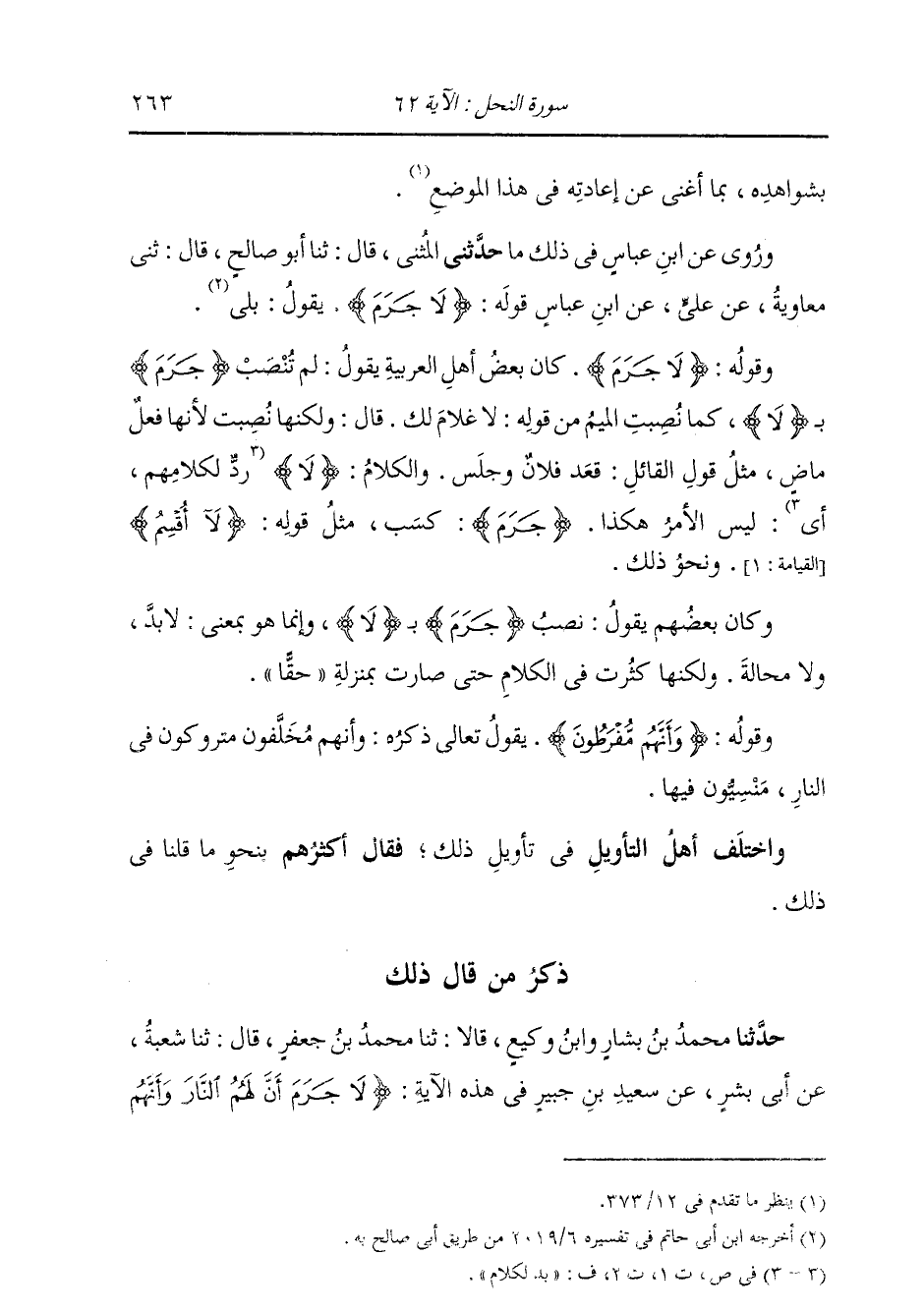 ذِكْرُ مَنْ قَالَ ذَلِكَ: حَدَّثَنَا مُحَمَّدُ بْنُ بَشَّارٍ، وَابْنُ وَكِيعٍ، قَالَا: ثنا مُحَمَّدُ بْنُ جَعْفَرٍ، قَالَ: ثنا شُعْبَةُ، عَنْ أَبِي بِشْرٍ، عَنْ سَعِيدِ بْنِ جُبَيْرٍ، فِي هَذِهِ الْآيَةِ: {§لَا جَرَمَ أَنَّ لَهُمُ النَّارَ وَأَنَّهُمْ -[264]- مُفْرَطُونَ} [النحل: 62] قَالَ: «مَنْسِيُّونَ مُضَيَّعُونَ» . حَدَّثَنِي مُوسَى بْنُ عَبْدِ الرَّحْمَنِ الْمَسْرُوقِيُّ قَالَ: ثنا زَيْدُ بْنُ حُبَابٍ قَالَ: أَخْبَرَنَا سَعِيدٌ، عَنْ أَبِي بِشْرٍ، عَنْ سَعِيدِ بْنِ جُبَيْرٍ، مِثْلَهُ. حَدَّثَنَا ابْنُ حُمَيْدٍ قَالَ: ثنا بَهْزُ بْنُ أَسَدٍ، عَنْ شُعْبَةَ قَالَ: أَخْبَرَنِي أَبُو بِشْرٍ، عَنْ سَعِيدِ بْنِ جُبَيْرٍ، مِثْلَهُ