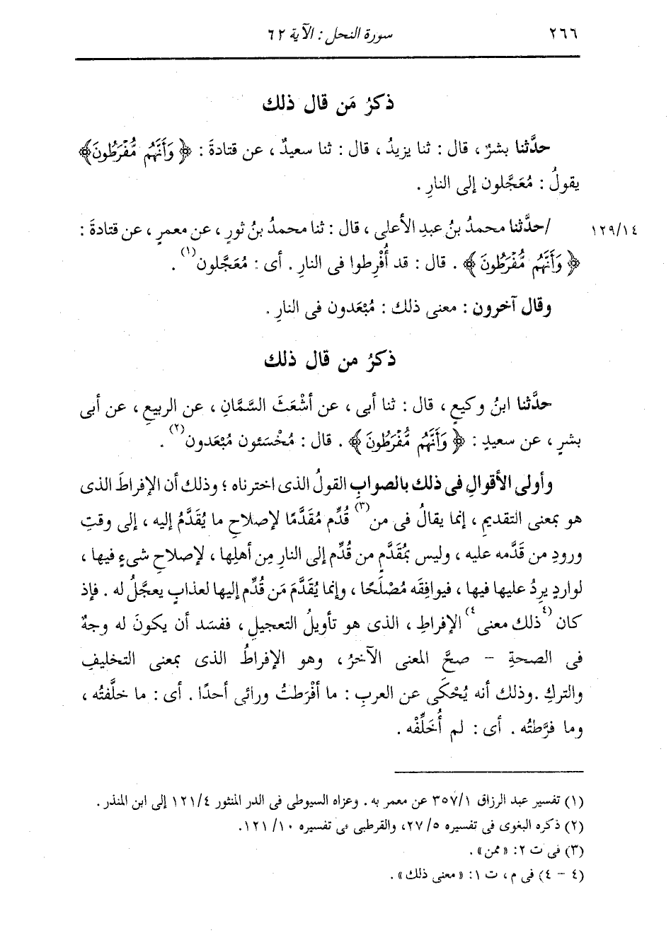 ذِكْرُ مَنْ قَالَ ذَلِكَ: حَدَّثَنَا بِشْرٌ، قَالَ: ثنا يَزِيدُ، قَالَ: ثنا سَعِيدٌ، عَنْ قَتَادَةَ: " {§وَأَنَّهُمْ مُفْرَطُونَ} [النحل: 62] يَقُولُ: مُعَجَّلُونَ إِلَى النَّارِ "