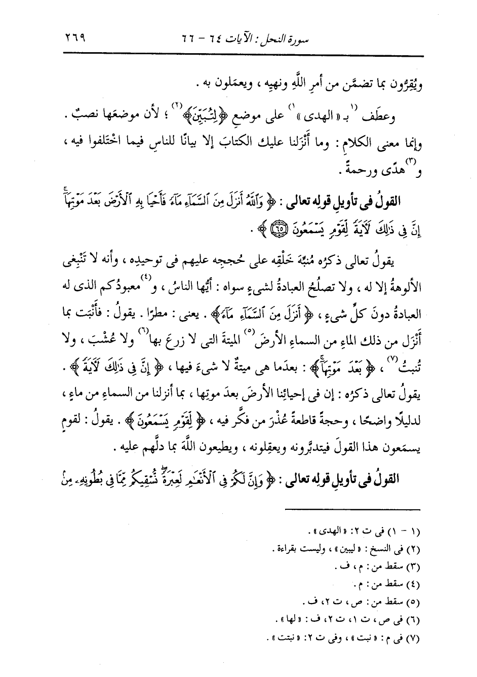 §الْقَوْلُ فِي تَأْوِيلِ قَوْلِهِ تَعَالَى: {وَاللَّهُ أَنْزَلَ مِنَ السَّمَاءِ مَاءً فَأَحْيَا بِهِ الْأَرْضَ بَعْدَ مَوْتِهَا، إِنَّ فِي ذَلِكَ لَآيَةً لِقَوْمٍ يَسْمَعُونَ} [النحل: 65] يَقُولُ تَعَالَى ذِكْرُهُ مُنَبِّهَ خَلْقِهِ عَلَى حُجَجِهِ عَلَيْهِمْ فِي تَوْحِيدِهِ، وَأَنَّهُ لَا تَنْبَغِي الْأُلُوهَةُ إِلَّا لَهُ، وَلَا تَصْلُحُ الْعِبَادَةُ لِشَيْءٍ سِوَاهُ: أَيُّهَا النَّاسُ، مَعْبُودَكُمُ الَّذِي لَهُ الْعِبَادَةُ دُونَ كُلِّ شَيْءٍ، {أَنْزَلَ مِنَ السَّمَاءِ مَاءً} [الأنعام: 99] يَعْنِي: مَطَرًا، يَقُولُ: فَأَنْبَتَ بِمَا أَنْزَلَ مِنْ ذَلِكَ الْمَاءِ مِنَ السَّمَاءِ الْأَرْضَ الْمَيْتَةَ الَّتِي لَا زَرْعَ بِهَا، وَلَا عُشْبَ، وَلَا نَبْتَ، {بَعْدَ مَوْتِهَا} [البقرة: 164] بَعْدَ مَا هِيَ مَيْتَةٌ لَا شَيْءَ فِيهَا. {إِنَّ فِي ذَلِكَ لَآيَةً} [البقرة: 248] يَقُولُ تَعَالَى ذِكْرُهُ: إِنَّ فِي إِحْيَائِنَا الْأَرْضَ بَعْدَ مَوْتِهَا بِمَا أَنْزَلْنَا مِنَ السَّمَاءِ مِنْ مَاءٍ لَدَلِيلًا وَاضِحًا وَحُجَّةً قَاطِعَةً عُذْرَ مَنْ فَكَّرَ فِيهِ {لِقَوْمٍ يَسْمَعُونَ} [يونس: 67] يَقُولُ: لِقَوْمٍ يَسْمَعُونَ هَذَا الْقَوْلَ فَيَتَدَبَّرُونَهُ وَيَعْقِلُونَهُ، وَيُطِيعُونَ اللَّهَ بِمَا دَلَّهُمْ عَلَيْهِ