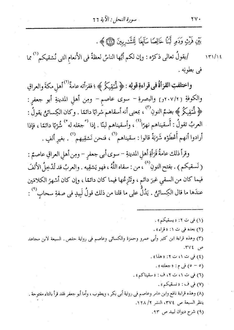 بَيْنِ فَرْثٍ وَدَمٍ لَبَنََا خَالِصًا سَائِغًا لِلشَّارِبِينَ} [النحل: 66] يَقُولُ تَعَالَى ذِكْرُهُ: وَإِنَّ لَكُمْ أَيُّهَا النَّاسُ لَعِظَةً فِي الْأَنْعَامِ الَّتِي نُسْقِيكُمْ مِمَّا فِي بُطُونِهِ. وَاخْتَلَفَتِ الْقُرَّاءُ فِي قِرَاءَةِ قَوْلِهِ: {نُسْقِيكُمْ} [النحل: 66] فَقَرَأَتْهُ عَامَّةُ أَهْلِ مَكَّةَ وَالْعِرَاقِ وَالْكُوفَةِ وَالْبَصْرَةِ، سِوَى عَاصِمٍ، وَمِنْ أَهْلِ الْمَدِينَةِ أَبُو جَعْفَرٍ: {نُسْقِيكُمْ} [النحل: 66] بِضَمِّ النُّونِ، بِمَعْنَى: أَنَّهُ أَسْقَاهُمْ شَرَابًا دَائِمًا، وَكَانَ الْكَسَائِيُّ يَقُولُ: الْعَرَبُ تَقُولُ: أَسْقَيْنَاهُمْ نَهْرًا وَأَسْقَيْنَاهُمْ لَبَنًا: إِذَا جَعَلْتَهُ شَرْبًا دَائِمًا، فَإِذَا أَرَادُوا أَنَّهُمْ أَعْطُوهُ شَرْبَةً قَالُوا: سَقَيْنَاهُمْ، فَنَحْنُ نَسْقِيهِمْ بِغَيْرِ أَلِفٍ، وَقَرَأَ ذَلِكَ عَامَّةُ قُرَّاءِ أَهْلِ الْمَدِينَةِ سِوَى أَبِي جَعْفَرٍ، وَمِنْ أَهْلِ الْعِرَاقِ عَاصِمٌ: (نَسْقِيكُمْ) بِفَتْحِ النُّونِ مِنْ سَقَاهُ اللَّهُ فَهُوَ يَسْقِيهِ، وَالْعَرَبُ قَدْ تُدْخِلُ الْأَلِفَ فِيمَا كَانَ مِنَ السَّقْيِ غَيْرَ دَائِمٍ وَتَنْزِعُهَا فِيمَا كَانَ دَائِمًا، وَإِنْ كَانَ أَشْهَرُ الْكَلَامَيْنِ عِنْدَهَا مَا قَالَ الْكَسَائِيُّ، يَدُلُّ عَلَى مَا قُلْنَا مِنْ ذَلِكَ، قَوْلُ لَبِيدٍ فِي صِفَةِ سَحَابٍ: