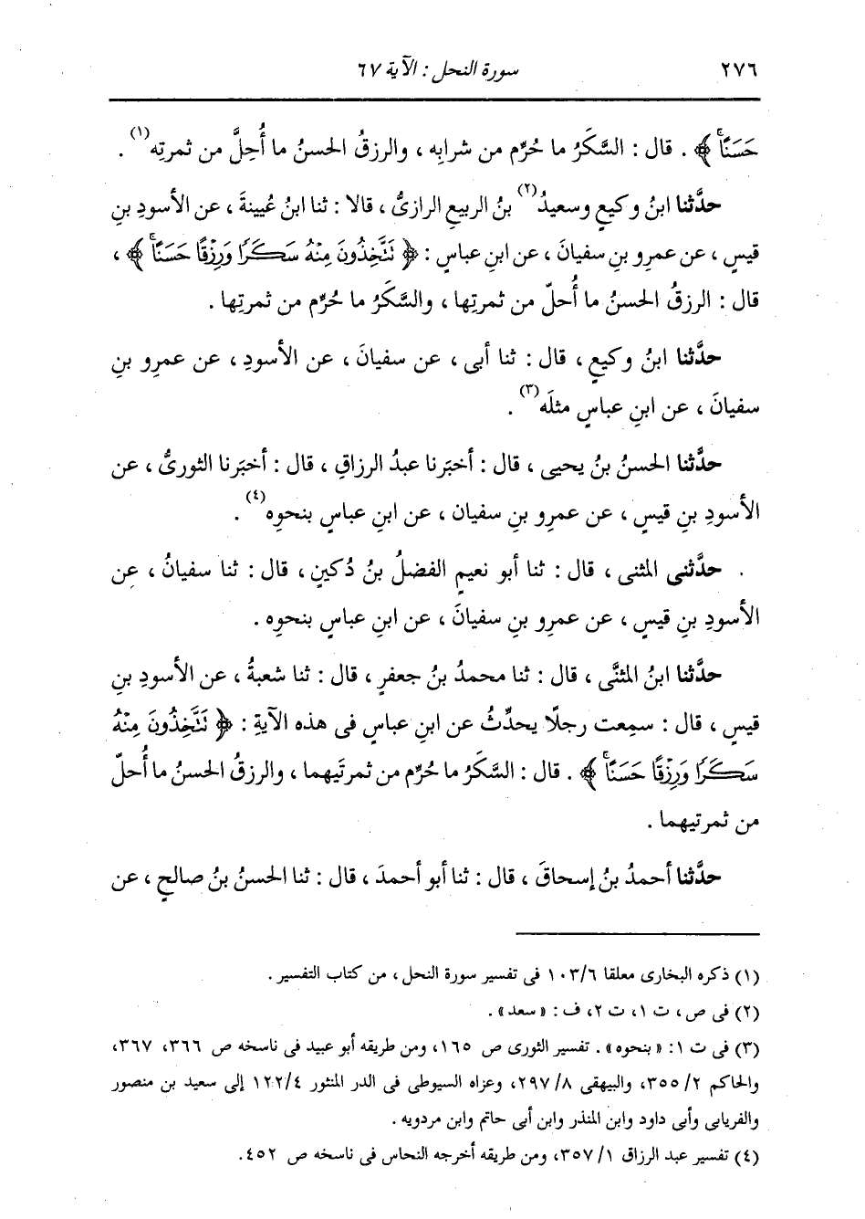 حَدَّثَنَا ابْنُ وَكِيعٍ، وَسَعِيدُ بْنُ الرَّبِيعِ الرَّازِيُّ قَالَا: ثنا ابْنُ عُيَيْنَةَ، عَنِ الْأَسْوَدِ بْنِ قَيْسٍ، عَنْ عَمْرِو بْنِ سُفْيَانَ، عَنِ ابْنِ عَبَّاسٍ: {§تَتَّخِذُونَ مِنْهُ سَكَرًا وَرِزْقًا حَسَنًا} [النحل: 67] قَالَ: " الرِّزْقُ الْحَسَنُ: مَا أُحِلَّ مِنْ ثَمَرَتِهَا، وَالسُّكْرُ: مَا حُرِّمَ مِنْ ثَمَرَتِهَا ". حَدَّثَنَا ابْنُ وَكِيعٍ قَالَ: ثنا أَبِي، عَنْ سُفْيَانَ، عَنِ الْأَسْوَدِ، عَنْ عَمْرِو بْنِ سُفْيَانَ، عَنِ ابْنِ عَبَّاسٍ مِثْلَهُ. حَدَّثَنَا الْحَسَنُ بْنُ يَحْيَى قَالَ: أَخْبَرَنَا عَبْدُ الرَّزَّاقِ قَالَ: أَخْبَرَنَا الثَّوْرِيُّ، عَنِ الْأَسْوَدِ بْنِ قَيْسٍ، عَنْ عَمْرِو بْنِ سُفْيَانَ، عَنِ ابْنِ عَبَّاسٍ، بِنَحْوِهِ. حَدَّثَنِي الْمُثَنَّى قَالَ: ثنا أَبُو نُعَيْمٍ الْفَضْلُ بْنُ دُكَيْنٍ قَالَ: ثنا سُفْيَانُ، عَنِ الْأَسْوَدِ بْنِ قَيْسٍ، عَنْ عَمْرِو بْنِ سُفْيَانَ، عَنِ ابْنِ عَبَّاسٍ بِنَحْوِهِ