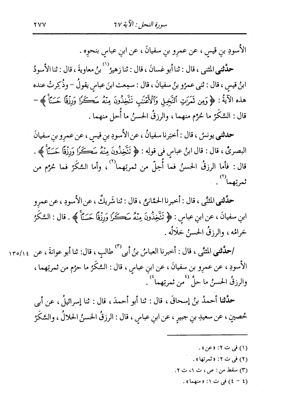 حَدَّثَنِي الْمُثَنَّى قَالَ: ثنا أَبُو غَسَّانَ قَالَ: ثنا زُهَيْرُ بْنُ مُعَاوِيَةَ قَالَ: ثنا الْأَسْوَدُ بْنُ قَيْسٍ قَالَ: ثني عَمْرُو بْنُ سُفْيَانَ قَالَ: سَمِعْتُ ابْنَ عَبَّاسٍ يَقُولُ، وَذُكِرَتْ عِنْدَهُ هَذِهِ الْآيَةُ: {§وَمِنْ ثَمَرَاتِ النَّخِيلِ وَالْأَعْنَابِ تَتَّخِذُونَ مِنْهُ سَكَرًا وَرِزْقًا حَسَنًا} [النحل: 67] قَالَ: " السَّكَرُ: مَا حُرِّمَ مِنْهُمَا، وَالرِّزْقُ الْحَسَنُ: مَا أُحِلَّ مِنْهُمَا "