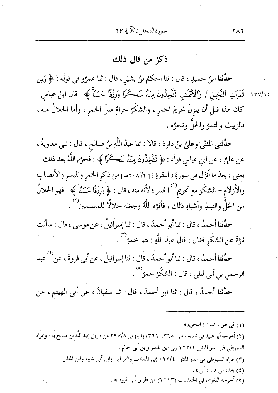 حَدَّثَنِي الْمُثَنَّى، وَعَلِيُّ بْنُ دَاوُدَ، قَالَا: ثنا عَبْدُ اللَّهِ بْنُ صَالِحٍ، قَالَ: ثني مُعَاوِيَةُ، عَنْ عَلِيٍّ، عَنِ ابْنِ عَبَّاسٍ، قَوْلُهُ: " {§تَتَّخِذُونَ مِنْهُ سَكَرًا} [النحل: 67] فَحَرَّمَ اللَّهُ بَعْدَ ذَلِكَ، يَعْنِي بَعْدَ مَا أَنْزَلَ فِي سُورَةِ الْبَقَرَةِ مِنْ ذِكْرِ الْخَمْرِ، وَالْمَيْسِرِ، وَالْأَنْصَابِ، وَالْأَزْلَامِ، السَّكَرَ مَعَ تَحْرِيمِ الْخَمْرِ لِأَنَّهُ مِنْهُ، قَالَ: {وَرِزْقًا حَسَنًا} [النحل: 67] فَهُوَ الْحَلَالُ مِنَ الْخَلِّ وَالنَّبِيذِ وَأَشْبَاهِ ذَلِكَ، فَأَقَرَّهُ اللَّهُ، وَجَعَلَهُ حَلَالًا لِلْمُسْلِمِينَ "