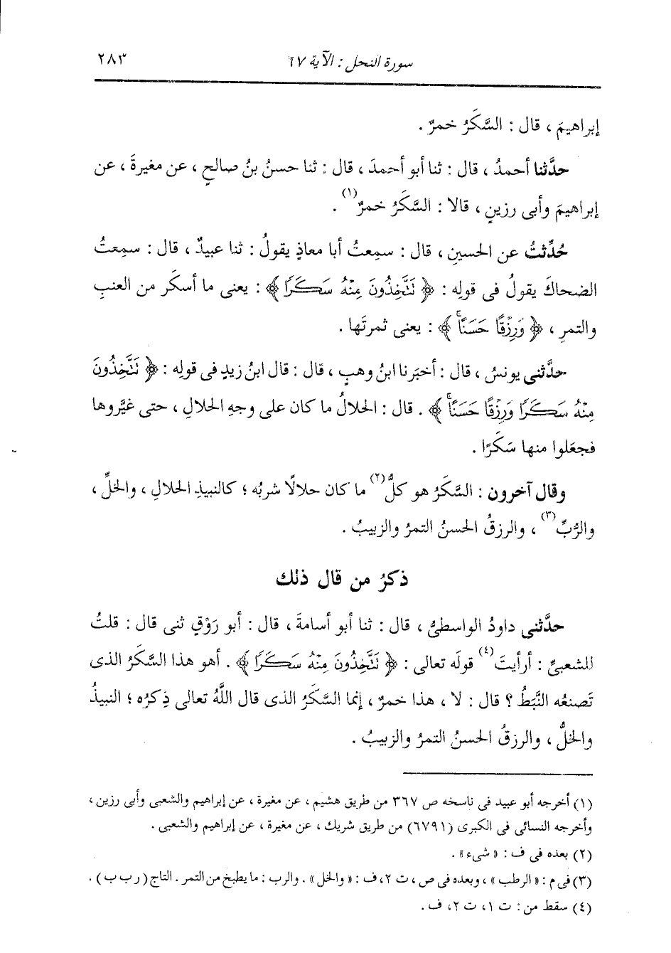 ذِكْرُ مَنْ قَالَ ذَلِكَ: حَدَّثَنِي دَاوُدُ الْوَاسِطِيُّ، قَالَ: ثنا أَبُو أُسَامَةَ، قَالَ أَبُو رَوْقٍ: ثني قَالُ: قُلْتُ لِلشَّعْبِيِّ: أَرَأَيْتَ قَوْلَهُ تَعَالَى: {تَتَّخِذُونَ مِنْهُ سَكَرًا} [النحل: 67] أَهُوَ هَذَا السَّكَرُ الَّذِي تَصْنَعُهُ النَّبَطُ؟ قَالَ: " لَا، §هَذَا خَمْرٌ، إِنَّمَا السَّكَرُ الَّذِي قَالَ اللَّهُ تَعَالَى ذِكْرُهُ: النَّبِيذُ وَالْخَلُّ، وَالرِّزْقُ الْحَسَنُ: التَّمْرُ وَالزَّبِيبُ ". -[284]- حَدَّثَنِي يَحْيَى بْنُ دَاوُدَ، قَالَ: ثنا أَبُو أُسَامَةَ، قَالَ: وَذَكَرَ مُجَالِدٌ، عَنْ عَامِرٍ، نَحْوَهُ