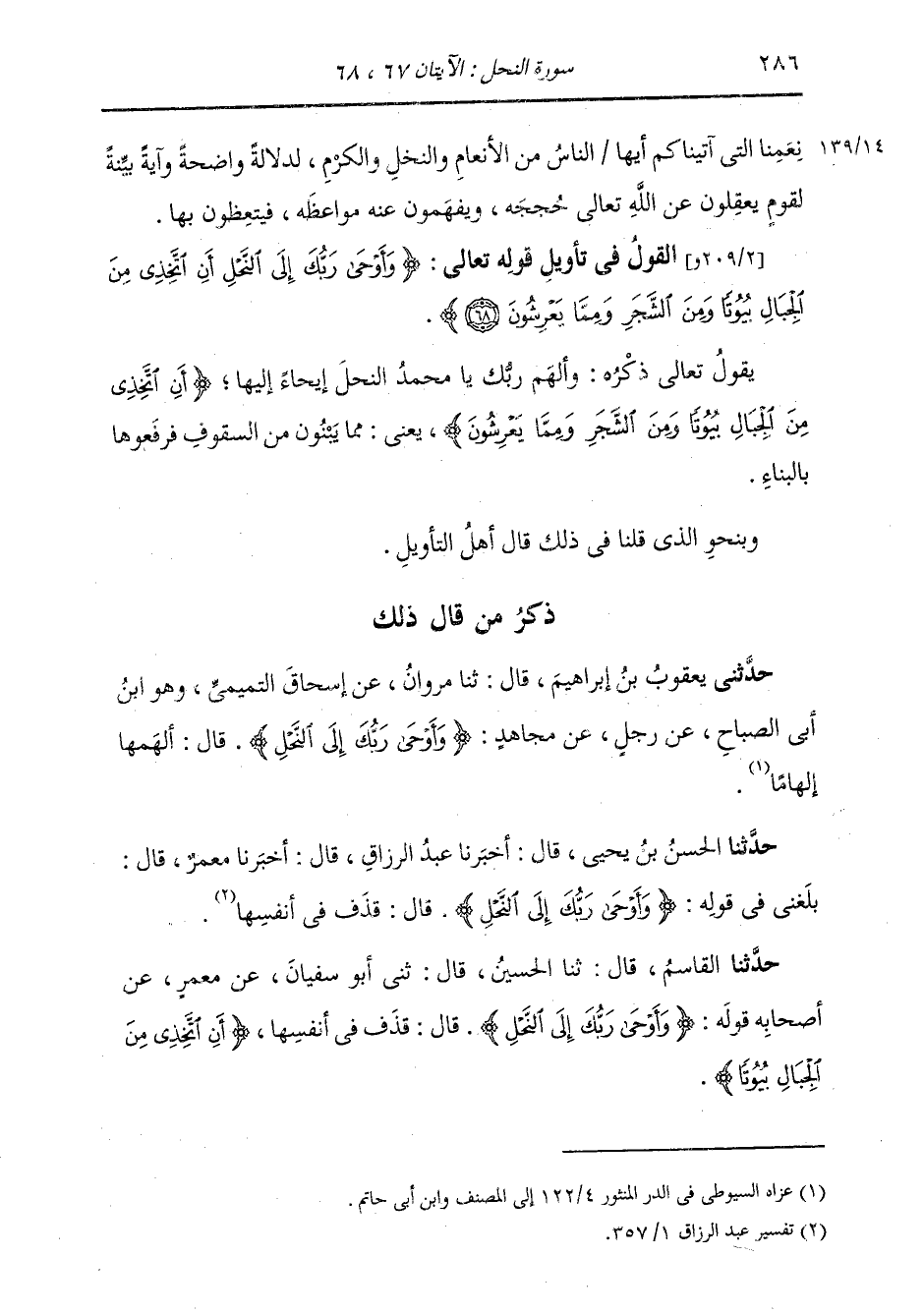 حَدَّثَنَا الْقَاسِمُ، قَالَ: ثنا الْحُسَيْنُ، قَالَ: ثني أَبُو سُفْيَانَ، عَنْ مَعْمَرٍ، عَنْ أَصْحَابِهِ، قَوْلُهُ: {§وَأَوْحَى رَبُّكَ إِلَى النَّحْلِ} [النحل: 68] قَالَ: «قَذَفَ فِي أَنْفُسِهَا أَنِ اتَّخِذِي مِنَ الْجِبَالِ بُيُوتًا»