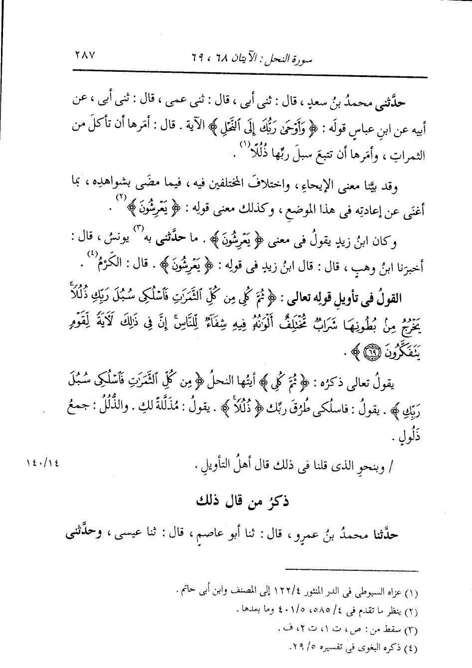 حَدَّثَنِي مُحَمَّدُ بْنُ سَعْدٍ، قَالَ: ثني أَبِي قَالَ: ثني عَمِّي قَالَ: ثني أَبِي، عَنْ أَبِيهِ، عَنِ ابْنِ عَبَّاسٍ، قَوْلُهُ: {§وَأَوْحَى رَبُّكَ إِلَى النَّحْلِ} [النحل: 68] الْآيَةَ، قَالَ: «أَمَرَهَا أَنْ تَأْكُلَ مِنَ الثَّمَرَاتِ، وَأَمَرَهَا أَنْ تَتَّبِعَ سُبُلَ رَبِّهَا ذُلُلًا» وَقَدْ بَيَّنَّا مَعْنَى الْإِيحَاءِ وَاخْتِلَافِ الْمُخْتَلِفِينَ فِيهِ فِيمَا مَضَى بِشَوَاهِدِهِ، بِمَا أَغْنَى عَنْ إِعَادَتِهِ فِي هَذَا الْمَوْضِعِ، وَكَذَلِكَ مَعْنَى قَوْلِهِ: {يَعْرِشُونَ} [النحل: 68] . وَكَانَ ابْنُ زَيْدٍ يَقُولُ فِي مَعْنَى يَعْرِشُونَ، مَا:
