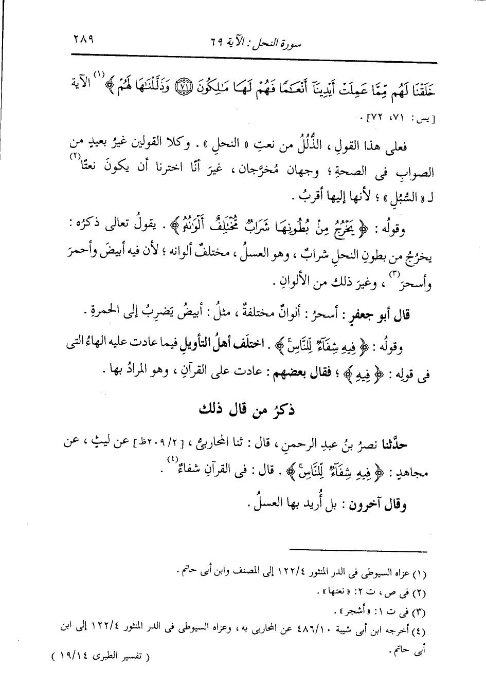 §وَقَوْلُهُ: {يَخْرُجُ مِنْ بُطُونِهَا شَرَابٌ مُخْتَلِفٌ أَلْوَانُهُ} [النحل: 69] يَقُولُ تَعَالَى ذِكْرُهُ: يَخْرُجُ مِنْ بُطُونِ النَّحْلِ شَرَابٌ، وَهُوَ الْعَسَلُ، مُخْتَلِفٌ أَلْوَانُهُ، لِأَنَّ فِيهَا أَبْيَضَ، وَأَحْمَرَ، وَأَسْحَرَ، وَغَيْرَ ذَلِكَ مِنَ الْأَلْوَانِ قَالَ أَبُو جَعْفَرٍ: «أَسْحَرَ» : أَلْوَانٌ مُخْتَلِفَةٌ مِثْلُ أَبْيَضَ، يَضْرِبُ إِلَى الْحُمْرَةِ