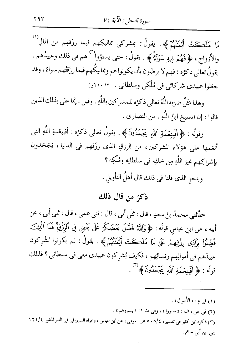 ذِكْرُ مَنْ قَالَ ذَلِكَ: حَدَّثَنِي مُحَمَّدُ بْنُ سَعْدٍ، قَالَ: ثني أَبِي قَالَ: ثني عَمِّي قَالَ: ثني أَبِي، عَنْ أَبِيهِ، عَنِ ابْنِ عَبَّاسٍ، قَوْلُهُ: {§وَاللَّهُ فَضَّلَ بَعْضَكُمْ عَلَى بَعْضٍ فِي الرِّزْقِ فَمَا الَّذِينَ فُضِّلُوا بِرَادِّي رِزْقِهِمْ عَلَى مَا مَلَكَتْ أَيْمَانُهُمْ} [النحل: 71] يَقُولُ: " لَمْ يَكُونُوا يُشْرِكُونَ عَبِيدَهُمْ فِي أَمْوَالِهِمْ وَنِسَائِهِمْ، فَكَيْفَ يُشْرِكُونَ عَبِيدِي مَعِي فِي سُلْطَانِي؟ فَذَلِكَ قَوْلُهُ: {أَفَبِنِعْمَةِ اللَّهِ يَجْحَدُونَ} [النحل: 71] "