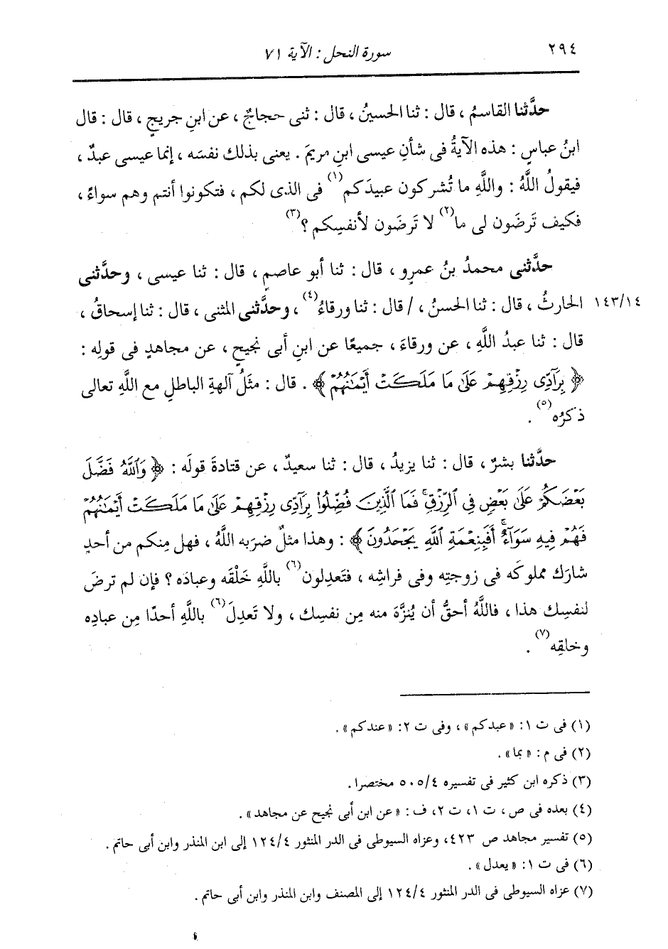 حَدَّثَنِي مُحَمَّدُ بْنُ عَمْرٍو، قَالَ: ثنا أَبُو عَاصِمٍ، قَالَ: ثنا عِيسَى، وَحَدَّثَنِي الْحَارِثُ، قَالَ: ثنا الْحَسَنُ، قَالَ: ثنا وَرْقَاءُ، وَحَدَّثَنِي الْمُثَنَّى، قَالَ: ثنا إِسْحَاقُ، قَالَ: ثنا عَبْدُ اللَّهِ، عَنْ وَرْقَاءَ، جَمِيعًا، عَنِ ابْنِ أَبِي نَجِيحٍ، عَنْ مُجَاهِدٍ، فِي قَوْلِهِ: {§بِرَادِّي رِزْقِهِمْ عَلَى مَا مَلَكَتْ أَيْمَانُهُمْ} [النحل: 71] قَالَ: «مَثَلُ آلِهَةِ الْبَاطِلِ مَعَ اللَّهِ تَعَالَى ذِكْرُهُ»