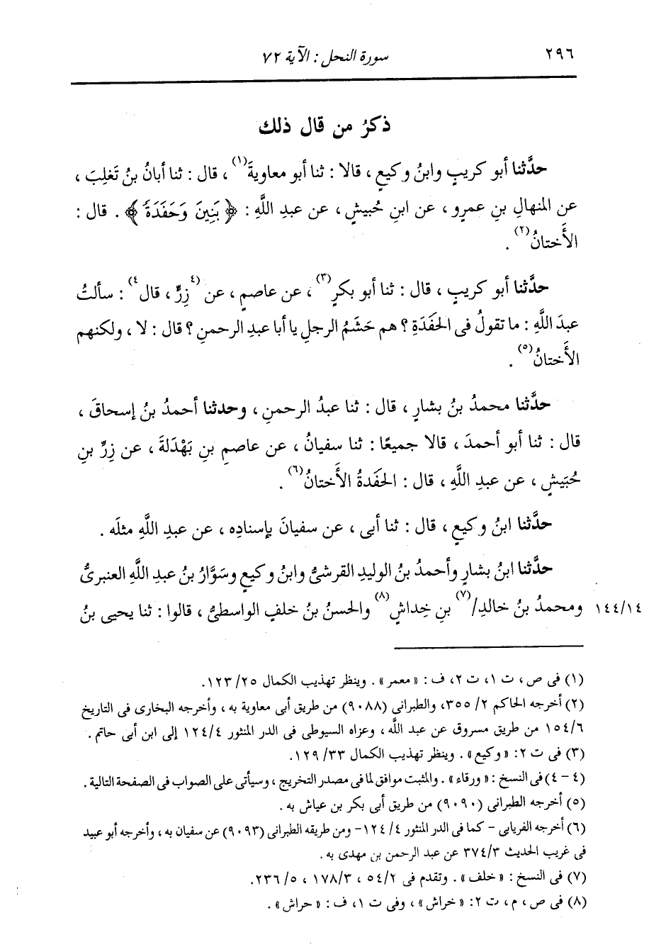 ذِكْرُ مَنْ قَالَ ذَلِكَ: حَدَّثَنَا أَبُو كُرَيْبٍ، وَابْنُ وَكِيعٍ، قَالَا: ثنا أَبُو مُعَاوِيَةَ، قَالَ: ثنا أَبَانُ بْنُ تَغْلِبَ، عَنِ الْمِنْهَالِ بْنِ عَمْرٍو، عَنِ ابْنِ حُبَيْشٍ، عَنْ عَبْدِ اللَّهِ: {§بَنِينَ وَحَفَدَةً} [النحل: 72] قَالَ: «الْأَخْتَانُ»