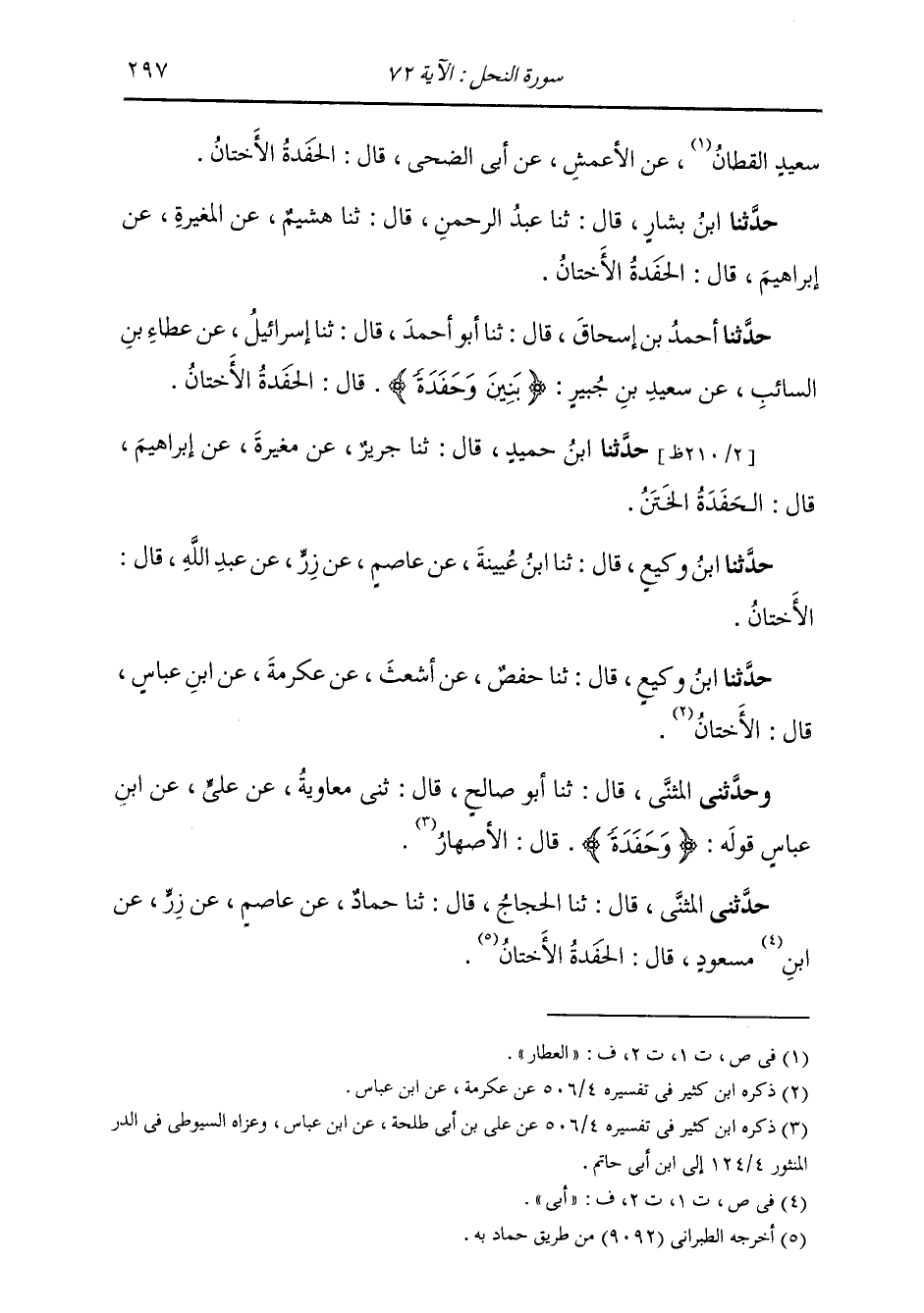حَدَّثَنِي الْمُثَنَّى قَالَ: ثنا الْحَجَّاجُ قَالَ: ثنا حَمَّادٌ، عَنْ عَاصِمٍ، عَنْ زِرٍّ، عَنِ ابْنِ مَسْعُودٍ، قَالَ: " §الْحَفَدَةُ: الْأَخْتَانُ "