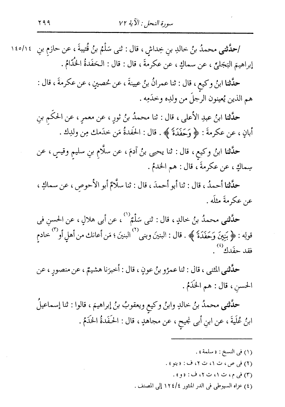 حَدَّثَنِي مُحَمَّدُ بْنُ خَالِدٍ، وَابْنُ وَكِيعٍ، وَيَعْقُوبُ بْنُ إِبْرَاهِيمَ، قَالُوا: ثنا إِسْمَاعِيلُ ابْنُ عُلَيَّةَ، عَنِ ابْنِ أَبِي نَجِيحٍ، عَنْ مُجَاهِدٍ، قَالَ: " §الْحَفَدَةُ: الْخَدَمُ "