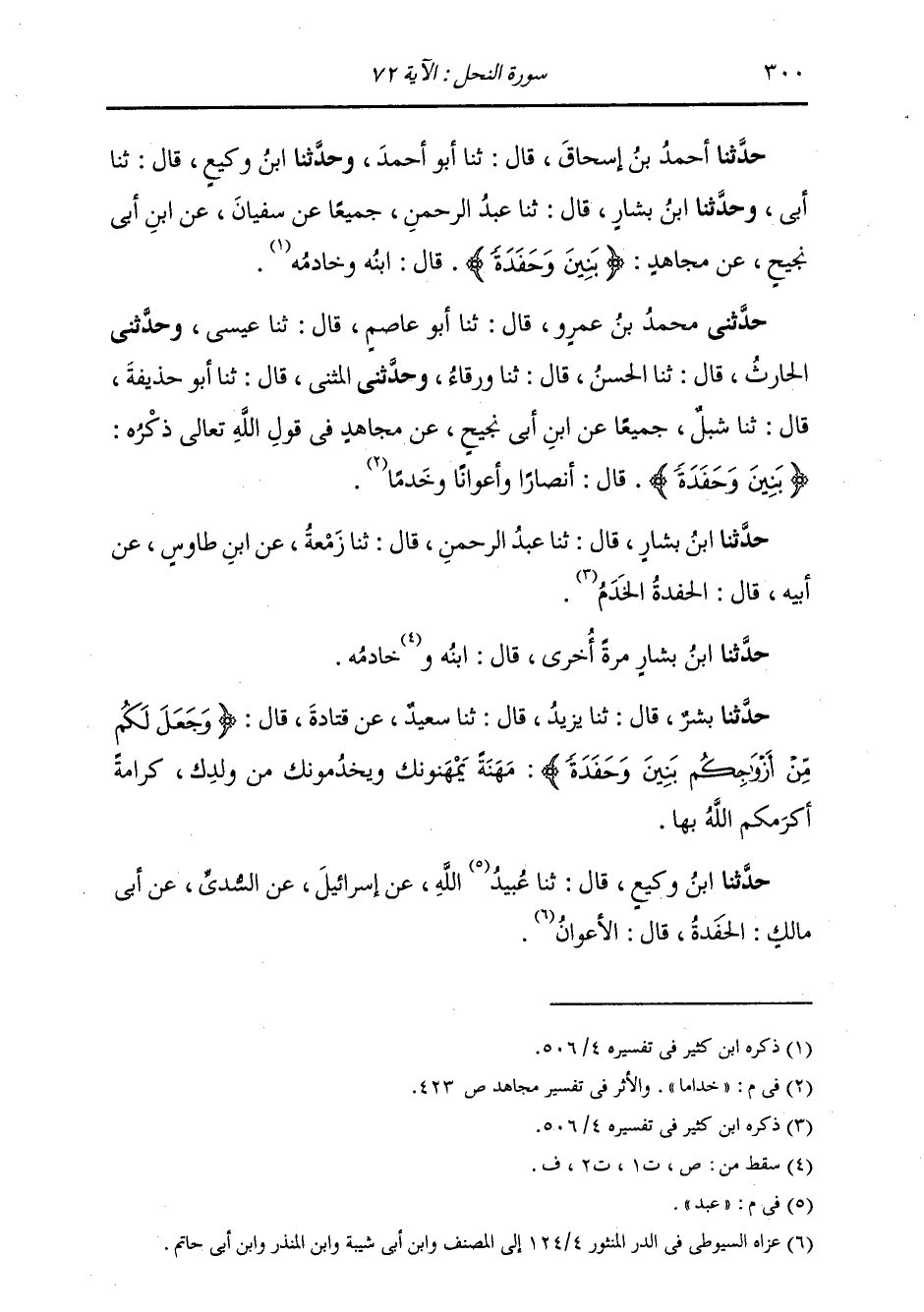 حَدَّثَنَا أَحْمَدُ بْنُ إِسْحَاقَ، قَالَ: ثنا أَبُو أَحْمَدَ، وَحَدَّثَنَا ابْنُ وَكِيعٍ، قَالَ: ثنا أَبِي، وَحَدَّثَنَا ابْنُ بَشَّارٍ، قَالَ: ثنا عَبْدُ الرَّحْمَنِ، جَمِيعًا عَنْ سُفْيَانَ، عَنِ ابْنِ أَبِي نَجِيحٍ، عَنْ مُجَاهِدٍ: {§بَنِينَ وَحَفَدَةً} [النحل: 72] قَالَ: «ابْنُهُ وَخَادِمُهُ»