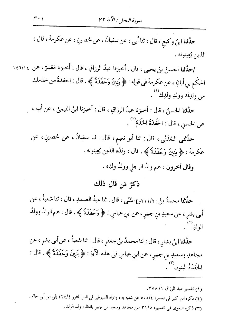 ذِكْرُ مَنْ قَالَ ذَلِكَ: حَدَّثَنَا مُحَمَّدُ بْنُ الْمُثَنَّى، قَالَ: ثنا عَبْدُ الصَّمَدِ، قَالَ: ثنا شُعْبَةُ، عَنْ أَبِي بِشْرٍ، عَنْ سَعِيدِ بْنِ جُبَيْرٍ، عَنِ ابْنِ عَبَّاسٍ: {§وَحَفَدَةً} [النحل: 72] قَالَ: «هُمُ الْوَلَدُ، وَوَلَدُ الْوَلَدِ»