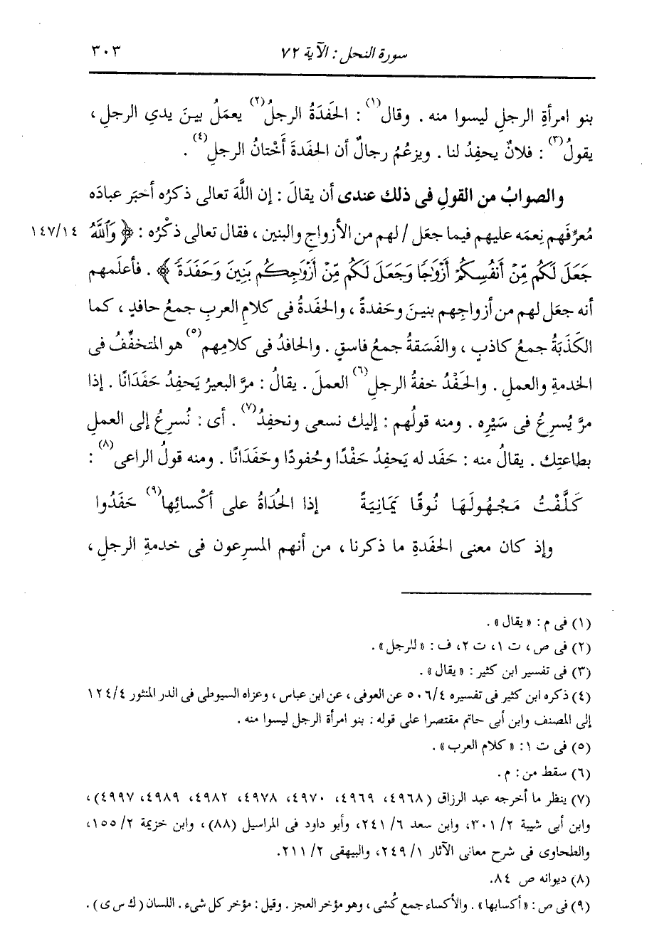 بَنُو امْرَأَةِ الرَّجُلِ لَيْسُوا مِنْهُ» وَيُقَالُ: الْحَفَدَةُ: الرَّجُلُ يَعْمَلُ بَيْنَ يَدَيِ الرَّجُلِ، يَقُولُ: فُلَانٌ يَحْفَدُ لَنَا، وَيَزْعُمُ رِجَالٌ أَنَّ الْحَفَدَةَ أَخْتَانُ الرَّجُلِ. وَالصَّوَابُ مِنَ الْقَوْلِ فِي ذَلِكَ عِنْدِي أَنْ يُقَالَ: إِنَّ اللَّهَ تَعَالَى أَخْبَرَ عِبَادَهُ مُعَرِّفَهُمْ نِعَمَهُ عَلَيْهِمْ، فِيمَا جَعَلَ لَهُمْ مِنَ الْأَزْوَاجِ وَالْبَنِينَ، فَقَالَ تَعَالَى: {وَاللَّهُ جَعَلَ لَكُمْ مِنْ أَنْفُسَكُمْ أَزْوَاجًا، وَجَعَلَ لَكُمْ مِنْ أَزْوَاجِكُمْ بَنِينَ وَحَفَدَةً} [النحل: 72] فَأَعْلَمَهُمْ أَنَّهُ جَعَلَ لَهُمْ مِنْ أَزْوَاجَهُمْ بَنِينَ وَحَفَدَةً، وَالْحَفَدَةُ فِي كَلَامِ الْعَرَبِ: جَمْعُ حَافِدٍ، كَمَا الْكَذَبَةُ: جَمْعُ كَاذِبٍ، وَالْفَسَقَةُ: جَمْعُ فَاسِقٍ، وَالْحَافِدُ فِي كَلَامِهِمْ: هُوَ الْمُتَخَفِّفُ فِي الْخِدْمَةِ وَالْعَمَلِ، وَالْحَفْدُ: خِفَّةُ الْعَمَلِ، يُقَالُ: مَرَّ الْبَعِيرُ يَحْفِدُ حَفَدَانًا: إِذَا مَرَّ يُسْرِعُ فِي سَيْرِهِ وَمِنْهُ، قَوْلُهُمْ: «إِلَيْكَ نَسْعَى وَنَحْفِدُ» : أَيْ نُسْرِعُ إِلَى الْعَمَلِ بِطَاعَتِكَ، يُقَالُ مِنْهُ: حَفَدَ لَهُ يَحْفِدُ حَفْدًا وَحُفُودًا وَحَفَدَانًا، وَمِنْهُ قَوْلُ الرَّاعِي:
