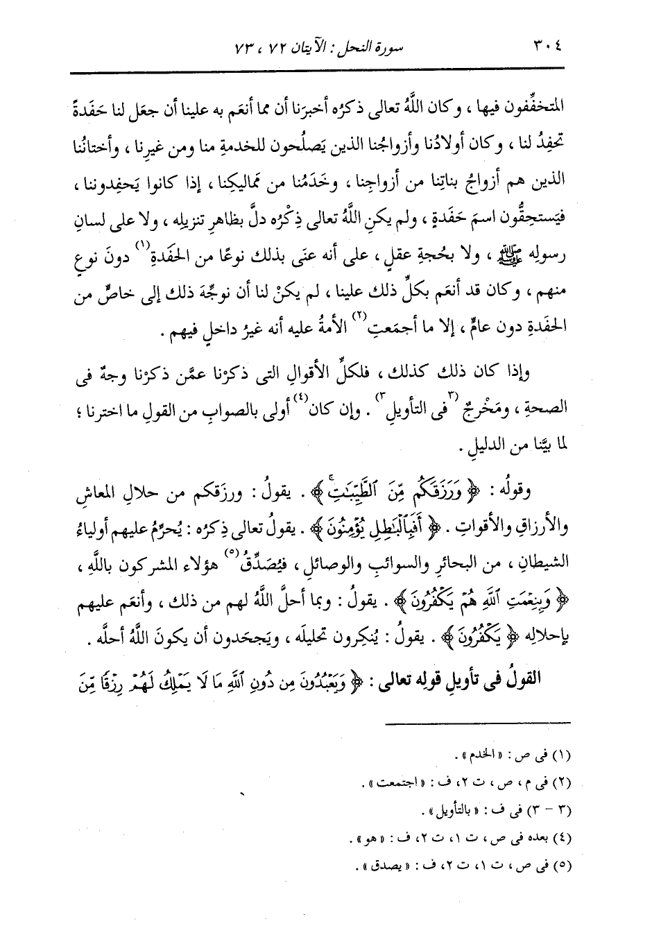 الْمُتَخَفِّفُونَ فِيهَا، وَكَانَ اللَّهُ تَعَالَى ذِكْرُهُ أَخْبَرَنَا أَنَّ مِمَّا أَنْعَمَ بِهِ عَلَيْنَا أَنْ جَعَلَ لَنَا حَفَدَةً تَحْفِدُ لَنَا، وَكَانَ أَوْلَادُنَا وَأَزْوَاجُنَا الَّذِينَ يُصْلِحُونَ لِلْخِدْمَةِ مِنَّا وَمِنْ غَيْرِنَا، وَأَخْتَانُنَا الَّذِينَ هُمْ أَزْوَاجُ بَنَاتِنَا مِنْ أَزْوَاجِنَا، وَخَدَمِنَا مِنْ مَمَالِيكِنَا، إِذَا كَانُوا يَحْفِدُونَنَا فَيَسْتَحِقُّونَ اسْمَ حَفَدَةً، وَلَمْ يَكُنِ اللَّهُ تَعَالَى دَلَّ بِظَاهِرِ تَنْزِيلِهِ وَلَا عَلَى لِسَانِ رَسُولِهِ صَلَّى اللهُ عَلَيْهِ وَسَلَّمَ وَلَا بِحُجَّةِ عَقْلٍ، عَلَى أَنَّهُ عَنَى بِذَلِكَ نَوْعًا مِنَ الْحَفَدَةِ دُونَ نَوْعٍ مِنْهُمْ، وَكَانَ قَدْ أَنْعَمَ بِكُلِّ ذَلِكَ عَلَيْنَا، لَمْ يَكُنْ لَنَا أَنْ نُوَجِّهَ ذَلِكَ إِلَى خَاصٍّ مِنَ الْحَفَدَةِ دُونَ عَامٍ، إِلَّا مَا اجْتَمَعَتِ الْأُمَّةُ عَلَيْهِ أَنَّهُ غَيْرُ دَاخِلٍ فِيهِمْ، وَإِذَا كَانَ ذَلِكَ كَذَلِكَ فَلِكُلِّ الْأَقْوَالِ الَّتِي ذَكَرْنَا عَمَّنْ ذَكَرْنَا وَجْهٌ فِي الصِّحَّةِ، وَمَخْرَجٌ فِي التَّأْوِيلِ، وَإِنْ كَانَ أَوْلَى بِالصَّوَابِ مِنَ الْقَوْلِ مَا اخْتَرْنَا لِمَا بَيَّنَّا مِنَ الدَّلِيلِ