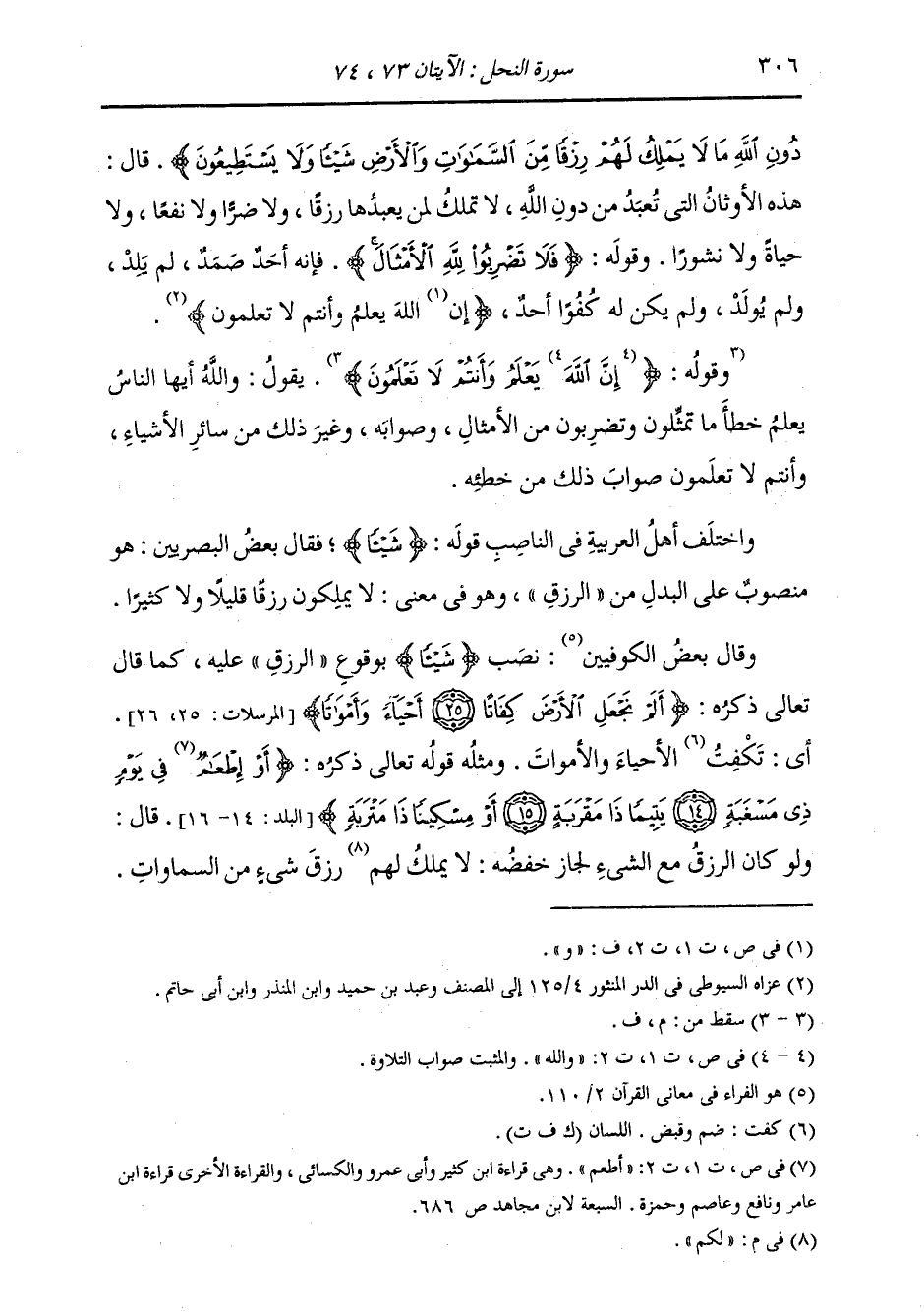 {§إِنَّ اللَّهَ يَعْلَمُ وَأَنْتُمْ لَا تَعْلَمُونَ} [النحل: 74] يَقُولُ: وَاللَّهُ أَيُّهَا النَّاسُ يَعْلَمُ خَطَأَ مَا تُمَثِّلُونَ وَتَضْرِبُونَ مِنَ الْأَمْثَالِ وَصَوَابُهُ، وَغَيْرُ ذَلِكَ مِنْ سَائِرِ الْأَشْيَاءِ، وَأَنْتُمْ لَا تَعْلَمُونَ صَوَابَ ذَلِكَ مِنْ خَطَئِهِ. وَاخْتَلَفَ أَهْلُ الْعَرَبِيَّةِ فِي النَّاصِبِ قَوْلُهُ: «شَيْئًا» فَقَالَ بَعْضُ الْبَصْرِيِّينَ: هُوَ مَنْصُوبٌ عَلَى الْبَدَلِ مِنَ الرِّزْقِ، وَهُوَ فِي مَعْنَى: لَا يَمْلِكُونَ رِزْقًا قَلِيلًا وَلَا كَثِيرًا وَقَالَ بَعْضُ الْكُوفِيِّينَ: نُصِبَ «شَيْئًا» بِوُقُوعِ الرِّزْقِ عَلَيْهِ، كَمَا قَالَ تَعَالَى ذِكْرُهُ: {أَلَمْ نَجْعَلِ الْأَرْضَ كِفَاتًا، أَحْيَاءً وَأَمْوَاتًا} [المرسلات: 26] ، أَيْ تَكْفِتُ الْأَحْيَاءَ وَالْأَمْوَاتَ، وَمِثْلُهُ قَوْلُهُ تَعَالَى ذِكْرُهُ: {أَوْ إِطْعَامٌ فِي يَوْمٍ ذِي مَسْغَبَةٍ. يَتِيمًا ذَا مَقْرَبَةٍ. أَوْ مِسْكِينًا ذَا مَتْرَبَةٍ} [البلد: 14] ، قَالَ: وَلَوْ كَانَ الرِّزْقُ مَعَ الشَّيْءِ لَجَازَ خَفْضُهُ، لَا يَمْلِكُ لَكُمْ رِزْقَ شَيْءٍ مِنَ السَّمَاوَاتِ،