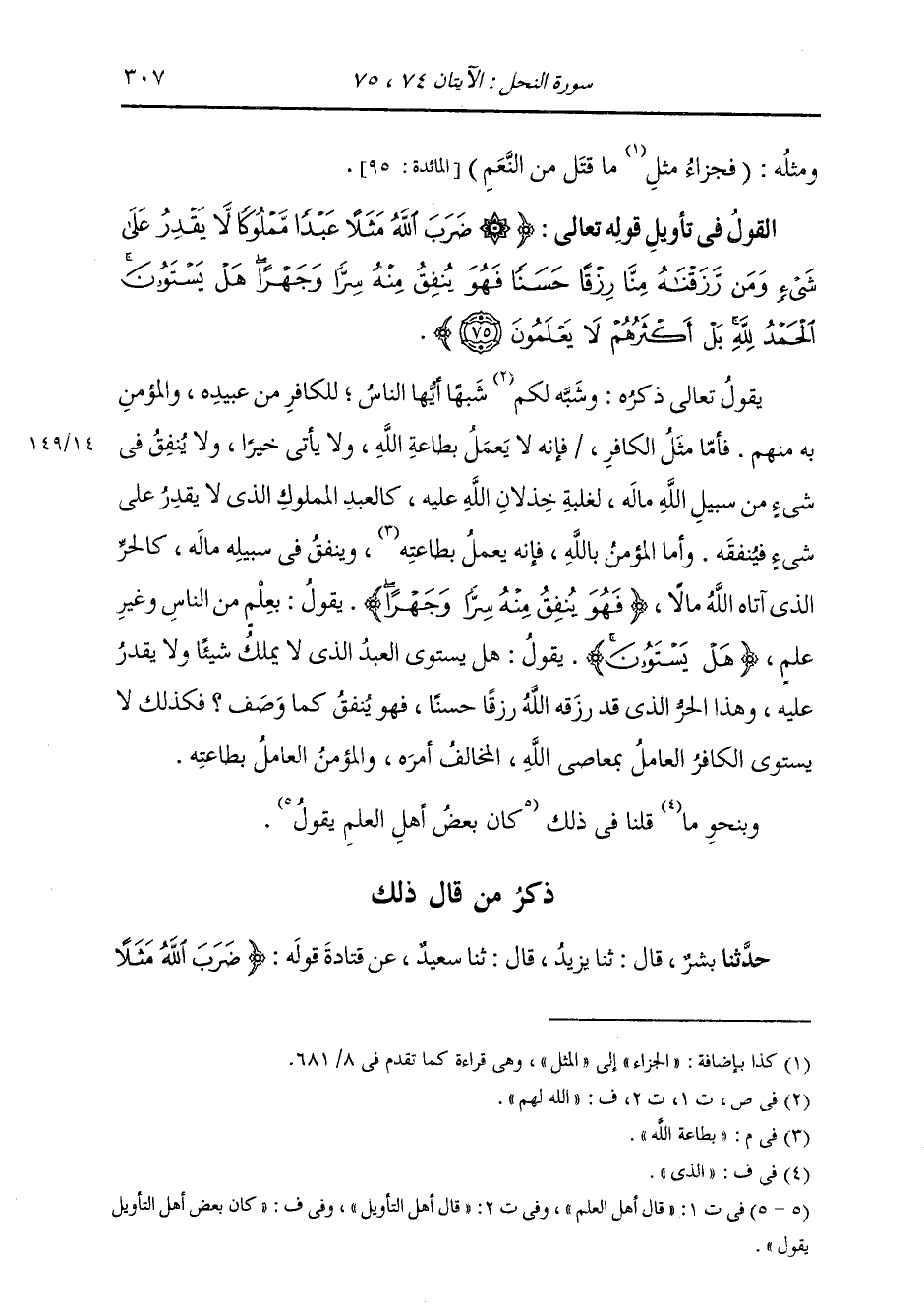 §الْقَوْلُ فِي تَأْوِيلِ قَوْلِهِ تَعَالَى: {ضَرَبَ اللَّهُ مَثَلًا عَبْدًا مَمْلُوكًا لَا يَقْدِرُ عَلَى شَيْءٍ وَمَنْ رَزَقْنَاهُ مِنَّا رِزْقًا حَسَنًا فَهُوَ يُنْفِقُ مِنْهُ سِرًّا وَجَهْرًا، هَلْ يَسْتَوُونَ، الْحَمْدُ للَّهِ، بَلْ أَكْثَرُهُمْ لَا يَعْلَمُونَ} [النحل: 75] يَقُولُ تَعَالَى ذِكْرُهُ: وَشَبَّهَ لَكُمْ شَبَهًا أَيُّهَا النَّاسُ لِلْكَافِرِ مِنْ عَبِيدِهِ، وَالْمُؤْمِنُ بِهِ مِنْهُمْ، فَأَمَّا مَثَلُ الْكَافِرِ: فَإِنَّهُ لَا يَعْمَلُ بِطَاعَةِ اللَّهِ، وَلَا يَأْتِي خَيْرًا، وَلَا يُنْفِقُ فِي شَيْءٍ مِنْ سَبِيلِ اللَّهِ مَالَهُ لَغَلَبَةِ خِذْلَانِ اللَّهِ عَلَيْهِ، كَالْعَبْدِ الْمَمْلُوكِ الَّذِي لَا يَقْدِرُ عَلَى شَيْءٍ فَيُنْفِقُهُ، وَأَمَّا الْمُؤْمِنُ بِاللَّهِ فَإِنَّهُ يَعْمَلُ بِطَاعَةِ اللَّهِ، وَيُنْفِقُ فِي سَبِيلِهِ مَالَهُ، كَالْحُرِّ الَّذِي آتَاهُ اللَّهُ مَالًا فَهُوَ يُنْفِقُ مِنْهُ سِرًّا وَجَهْرًا، يَقُولُ: بِعِلْمٍ مِنَ النَّاسِ وَغَيْرِ عِلْمٍ {هَلْ يَسْتَوُونَ} [النحل: 75] يَقُولُ: هَلْ يَسْتَوِي الْعَبْدُ الَّذِي لَا يَمْلِكُ شَيْئًا وَلَا يَقْدِرُ عَلَيْهِ، وَهَذَا الْحُرُّ الَّذِي قَدْ رَزَقَهُ اللَّهُ رِزْقًا حَسَنًا فَهُوَ يُنْفِقُ كَمَا وَصَفَ؟ فَكَذَلِكَ لَا يَسْتَوِي الْكَافِرُ الْعَامِلُ بِمَعَاصِي اللَّهِ الْمُخَالِفُ أَمْرَهُ وَالْمُؤْمِنُ الْعَامِلُ بِطَاعَتِهِ. وَبِنَحْوِ مَا قُلْنَا فِي ذَلِكَ كَانَ بَعْضُ أَهْلِ الْعِلْمِ يَقُولُ