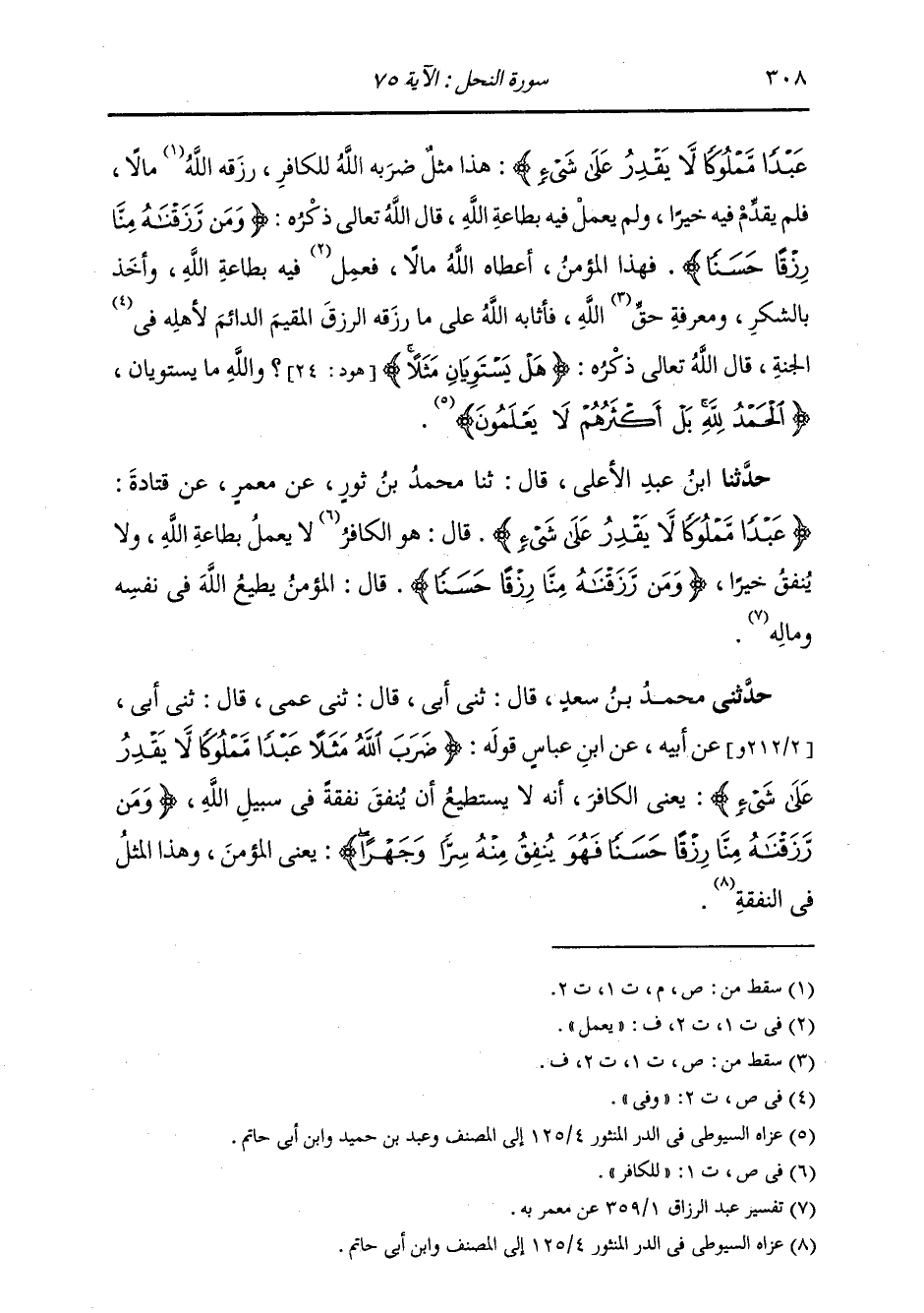 حَدَّثَنَا ابْنُ عَبْدِ الْأَعْلَى، قَالَ: ثنا مُحَمَّدُ بْنُ ثَوْرٍ، عَنْ مَعْمَرٍ، عَنْ قَتَادَةَ: {§عَبْدًا مَمْلُوكًا لَا يَقْدِرُ عَلَى شَيْءٍ} [النحل: 75] قَالَ: " هُوَ الْكَافِرُ، لَا يَعْمَلُ بِطَاعَةِ اللَّهِ، وَلَا يُنْفِقُ خَيْرًا {وَمَنْ رَزَقْنَاهُ مِنَّا رِزْقًا حَسَنًا} [النحل: 75] قَالَ: «الْمُؤْمِنُ يُطِيعُ اللَّهَ فِي نَفْسِهِ وَمَالِهِ»