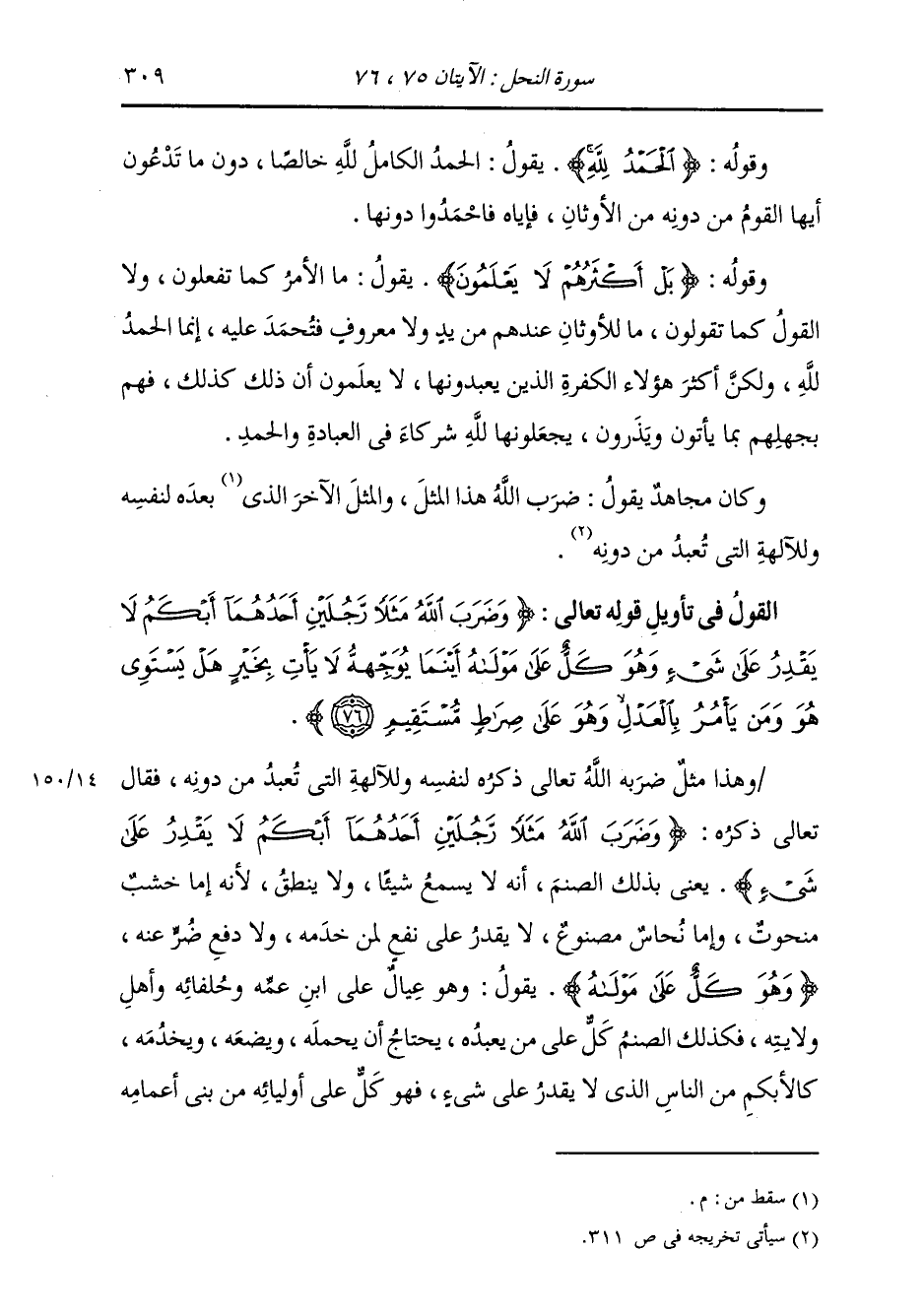 §الْقَوْلُ فِي تَأْوِيلِ قَوْلِهِ تَعَالَى: {وَضَرَبَ اللَّهُ مَثَلًا رَجُلَيْنِ أَحَدُهُمَا أَبْكَمُ لَا يَقْدِرُ عَلَى شَيْءٍ وَهُوَ كَلٌّ عَلَى مَوْلَاهُ، أَيْنَمَا يُوَجِّهُهُ لَا يَأْتِ بِخَيْرٍ، هَلْ يَسْتَوِي هُوَ وَمَنْ يَأْمُرُ بِالْعَدْلِ وَهُوَ عَلَى صِرَاطٍ مُسْتَقِيمٍ} [النحل: 76] وَهَذَا مَثَلٌ ضَرَبَهُ اللَّهُ تَعَالَى لِنَفْسِهِ وَالْآلِهَةِ الَّتِي تُعْبَدُ مِنْ دُونِهِ، فَقَالَ تَعَالَى ذِكْرُهُ: {وَضَرَبَ اللَّهُ مَثَلًا رَجُلَيْنِ أَحَدُهُمَا أَبْكَمُ لَا يَقْدِرُ عَلَى شَيْءٍ} [النحل: 76] يَعْنِي بِذَلِكَ الصَّنَمَ أَنَّهُ لَا يَسْمَعُ شَيْئًا وَلَا يَنْطِقُ، لِأَنَّهُ إِمَّا خَشَبٌ مَنْحُوتٌ، وَإِمَّا نُحَاسٌ مَصْنُوعٌ، لَا يَقْدِرُ عَلَى نَفْعٍ لِمَنْ خَدَمَهُ، وَلَا دَفْعِ ضُرٍّ عَنْهُ {وَهُوَ كَلٌّ عَلَى مَوْلَاهُ} [النحل: 76] يَقُولُ: وَهُوَ عِيَالٌ عَلَى ابْنِ عَمِّهِ وَحُلَفَائِهِ وَأَهْلِ وِلَايَتِهِ، فَكَذَلِكَ الصَّنَمُ كَلٌّ عَلَى مَنْ يَعْبُدُهُ، يَحْتَاجُ أَنْ يَحْمِلَهُ وَيَضَعَهُ وَيَخْدِمَهُ، كَالْأَبْكَمِ مِنَ النَّاسِ الَّذِي لَا يَقْدِرُ عَلَى شَيْءٍ، فَهُوَ كَلٌّ عَلَى أَوْلِيَائِهِ مِنْ بَنِي أَعْمَامِهِ