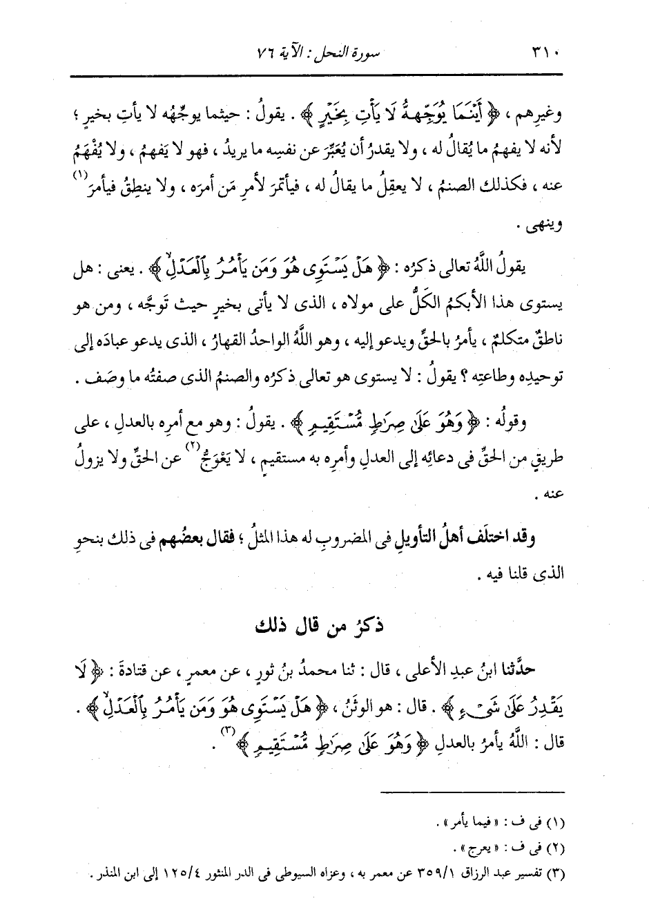 ذِكْرُ مَنْ قَالَ ذَلِكَ: حَدَّثَنَا ابْنُ عَبْدِ الْأَعْلَى، قَالَ: ثنا مُحَمَّدُ بْنُ ثَوْرٍ، عَنْ مَعْمَرٍ، عَنْ قَتَادَةَ: {§لَا يَقْدِرُ عَلَى شَيْءٍ} [النحل: 75] قَالَ: " هُوَ الْوَثَنُ {هَلْ يَسْتَوِي هُوَ وَمَنْ يَأْمُرُ بِالْعَدْلِ} [النحل: 76] قَالَ: " اللَّهُ يَأْمُرُ بِالْعَدْلِ {وَهُوَ عَلَى صِرَاطٍ مُسْتَقِيمٍ} [النحل: 76] ". -[311]- وَكَذَلِكَ كَانَ مُجَاهِدٌ يَقُولُ، إِلَّا أَنَّهُ كَانَ يَقُولُ: «الْمَثَلُ الْأَوَّلُ أَيْضًا ضَرَبَهُ اللَّهُ لِنَفْسِهِ وَلِلْوَثَنِ»